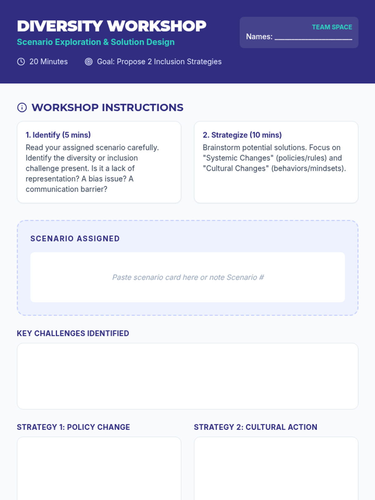 An interactive workshop worksheet and set of scenario cards for small group activities, focused on identifying diversity challenges and proposing inclusion strategies.
