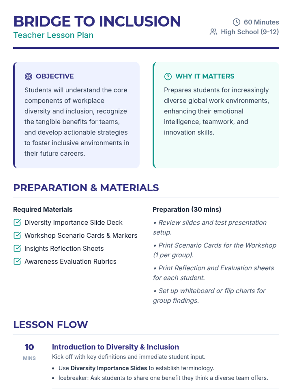 A comprehensive lesson plan for teachers, outlining the objectives, materials, and step-by-step flow for a 60-minute session on workplace diversity and inclusion.