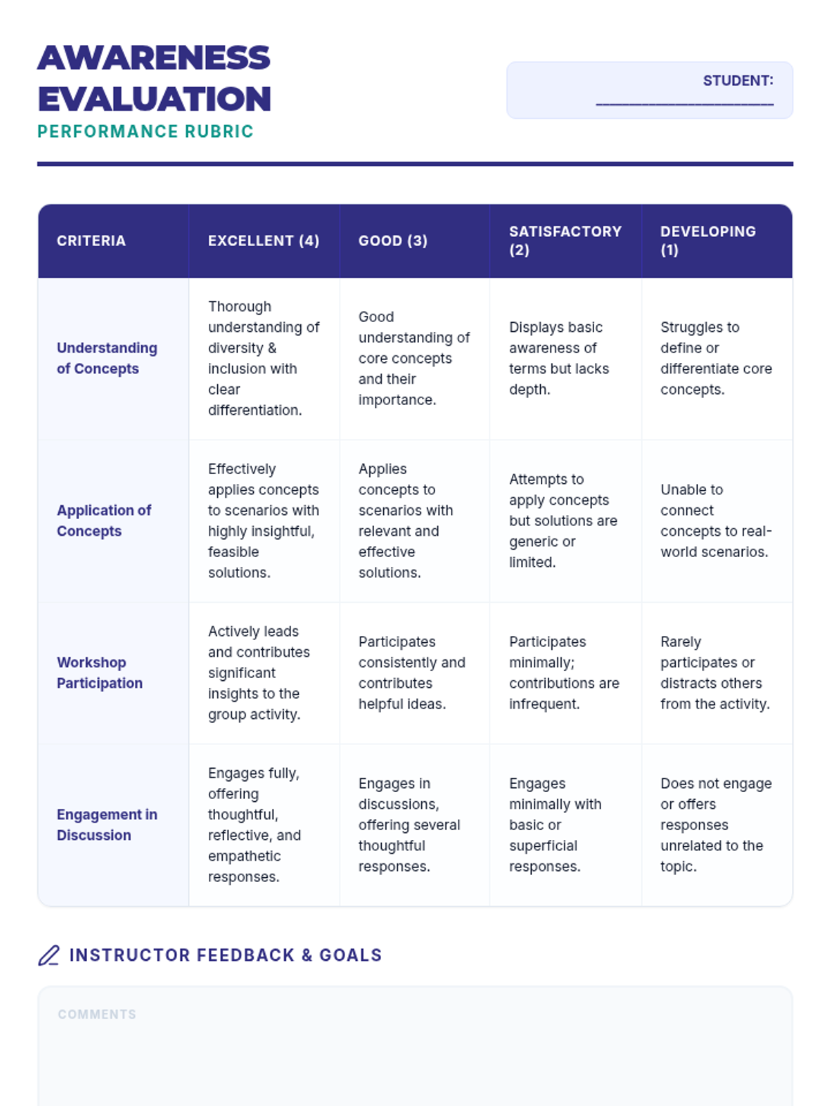 A professional evaluation rubric to assess students' understanding, application, and participation regarding workplace diversity and inclusion concepts.