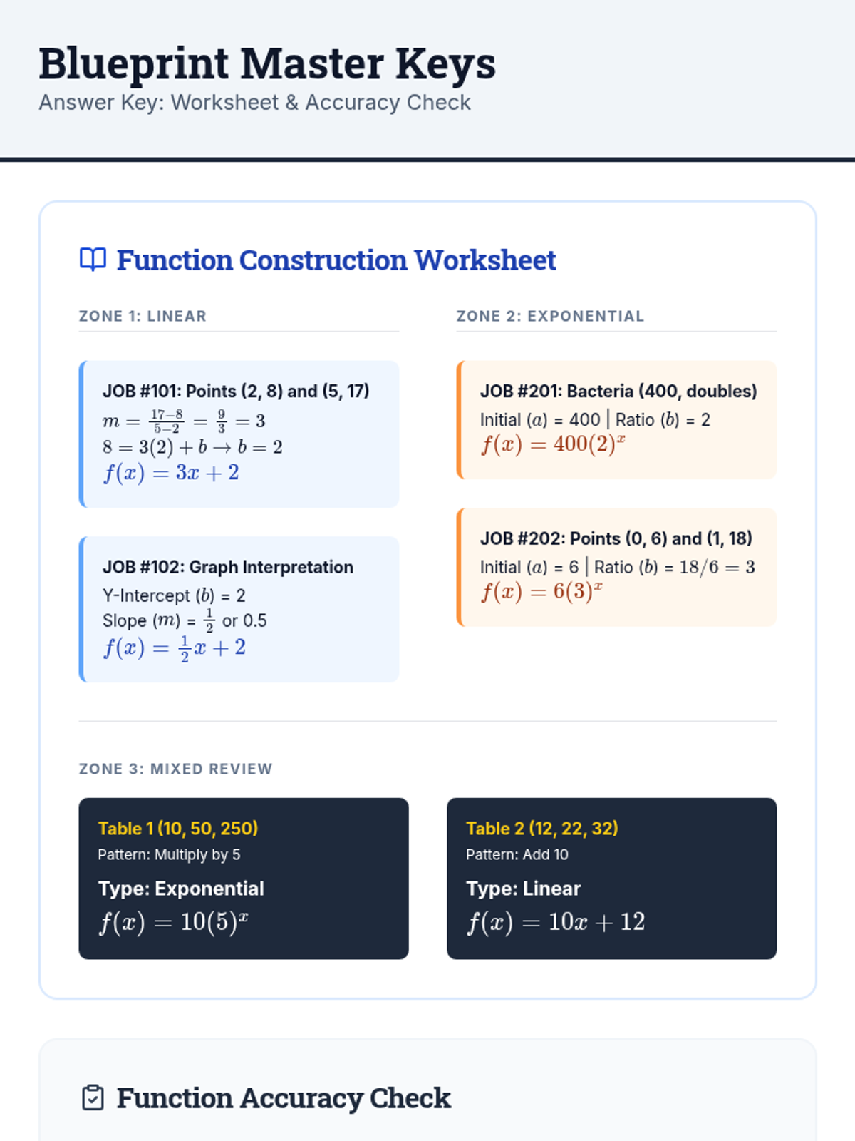 Updated answer keys for the Function Construction Worksheet and Function Accuracy Check, including the new graph interpretation problem.