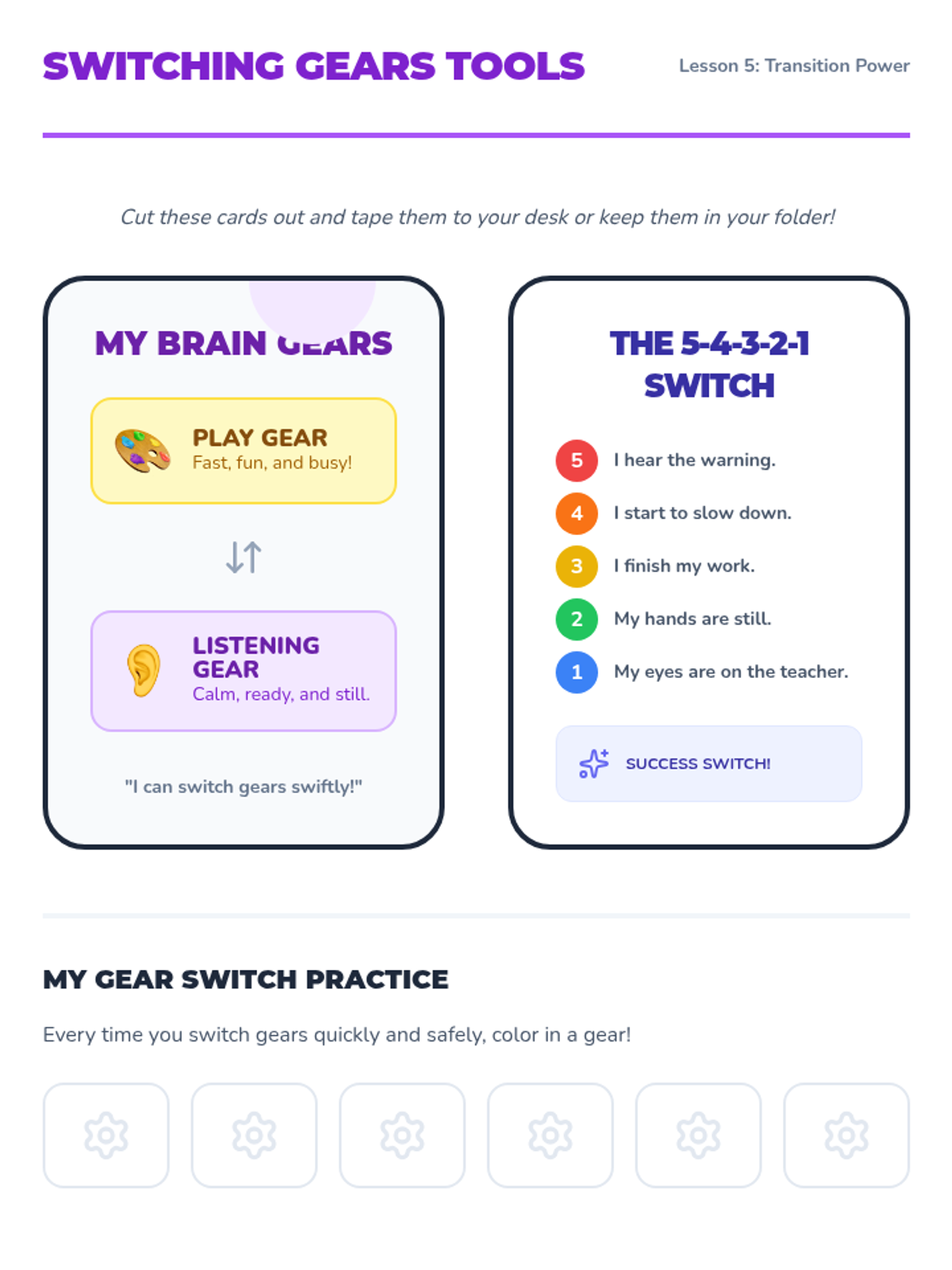 Visual cue cards and a practice log for 1st graders to master the 'Switching Gears' and 5-4-3-2-1 countdown strategies.