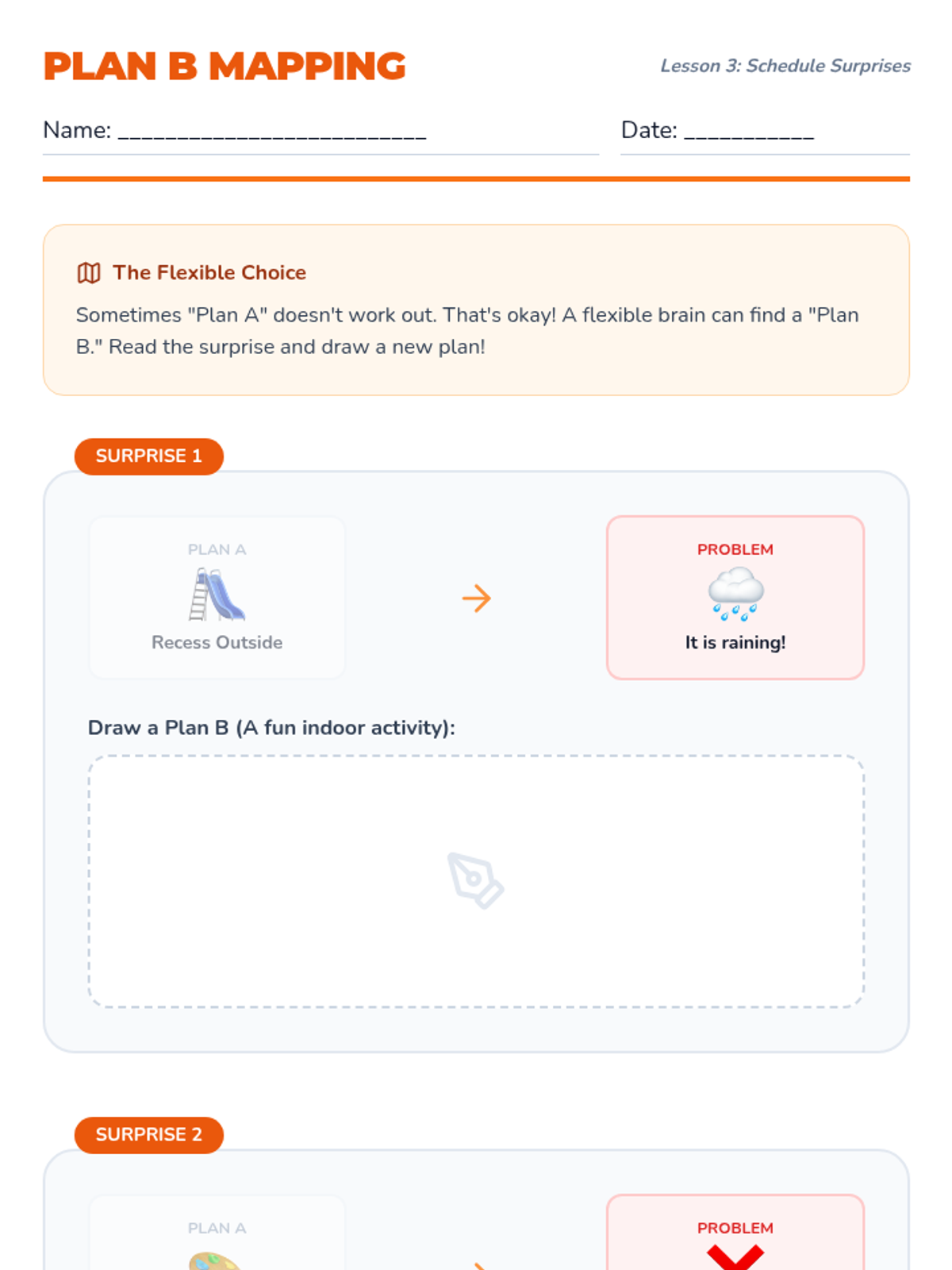 A worksheet where students practice 'Plan B' thinking by identifying alternative activities for common schedule changes.