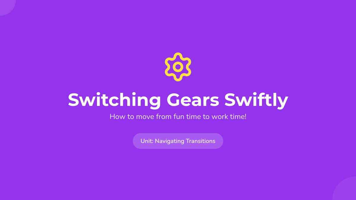 Visual presentation for 1st graders explaining the "Switching Gears" metaphor and teaching the 5-4-3-2-1 countdown strategy for transitions.