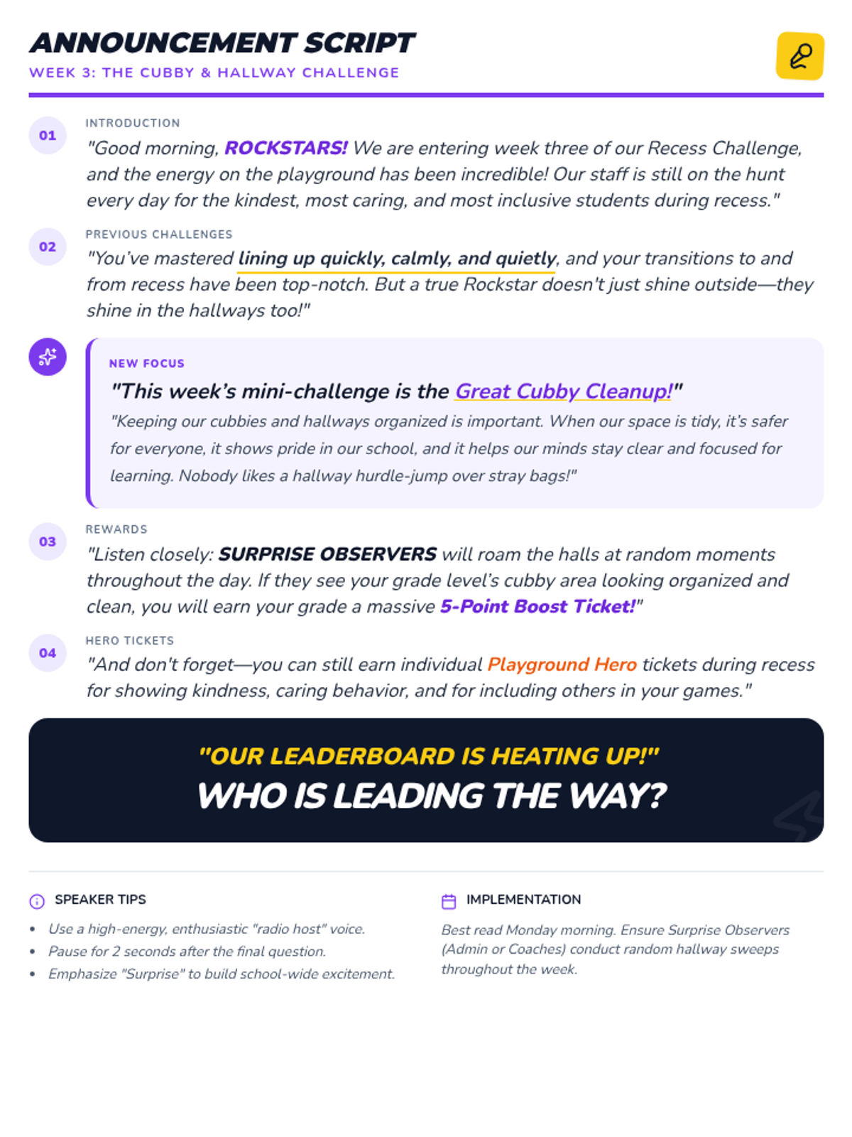 An announcement script for the third week of the Recess Rockstar Challenge, introducing the "Great Cubby Cleanup" mini-challenge and explaining the importance of tidiness for school pride and safety.