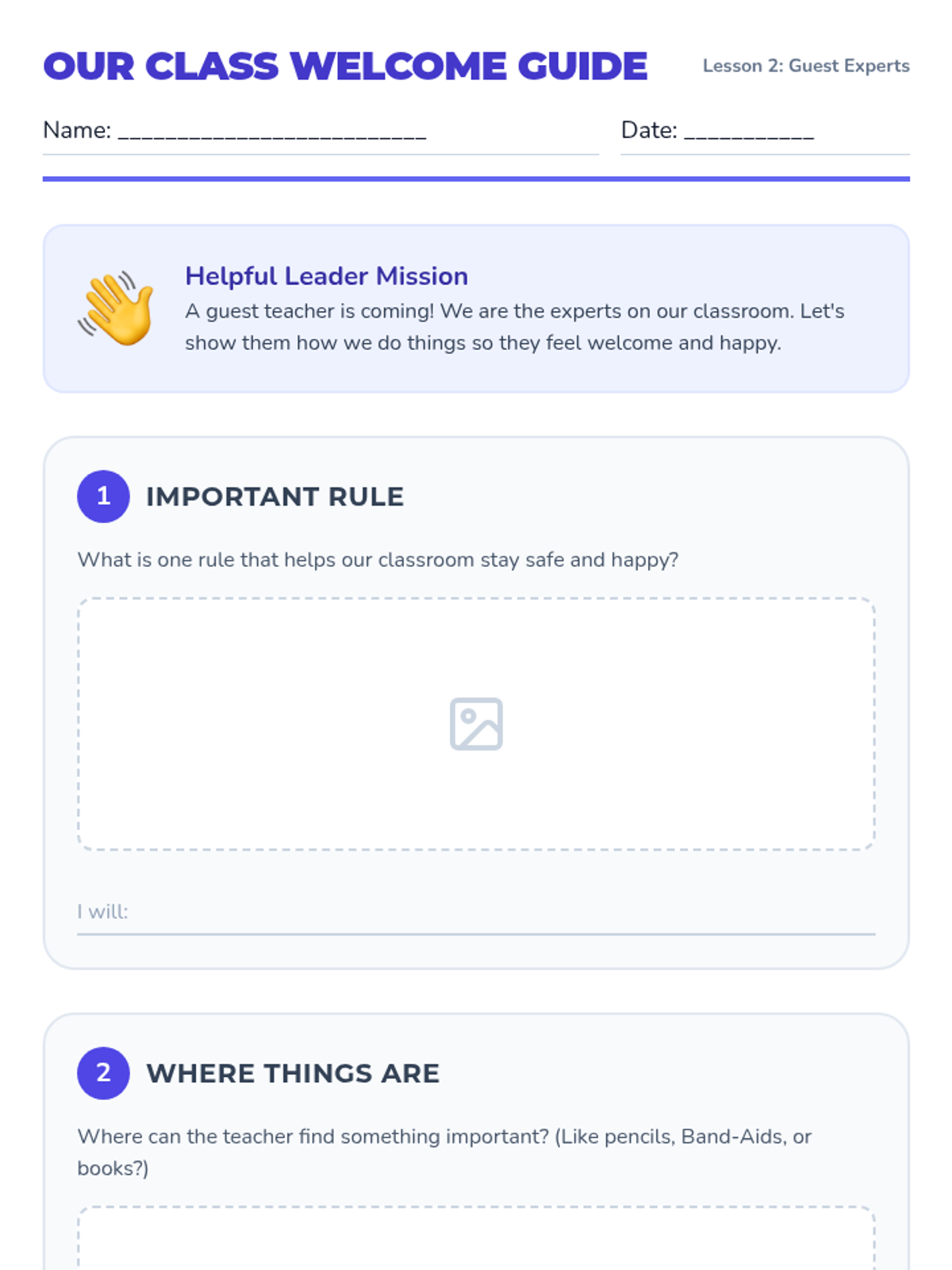 A student-facing worksheet where 1st graders draw and write about classroom rules and locations to help a guest teacher feel welcome.