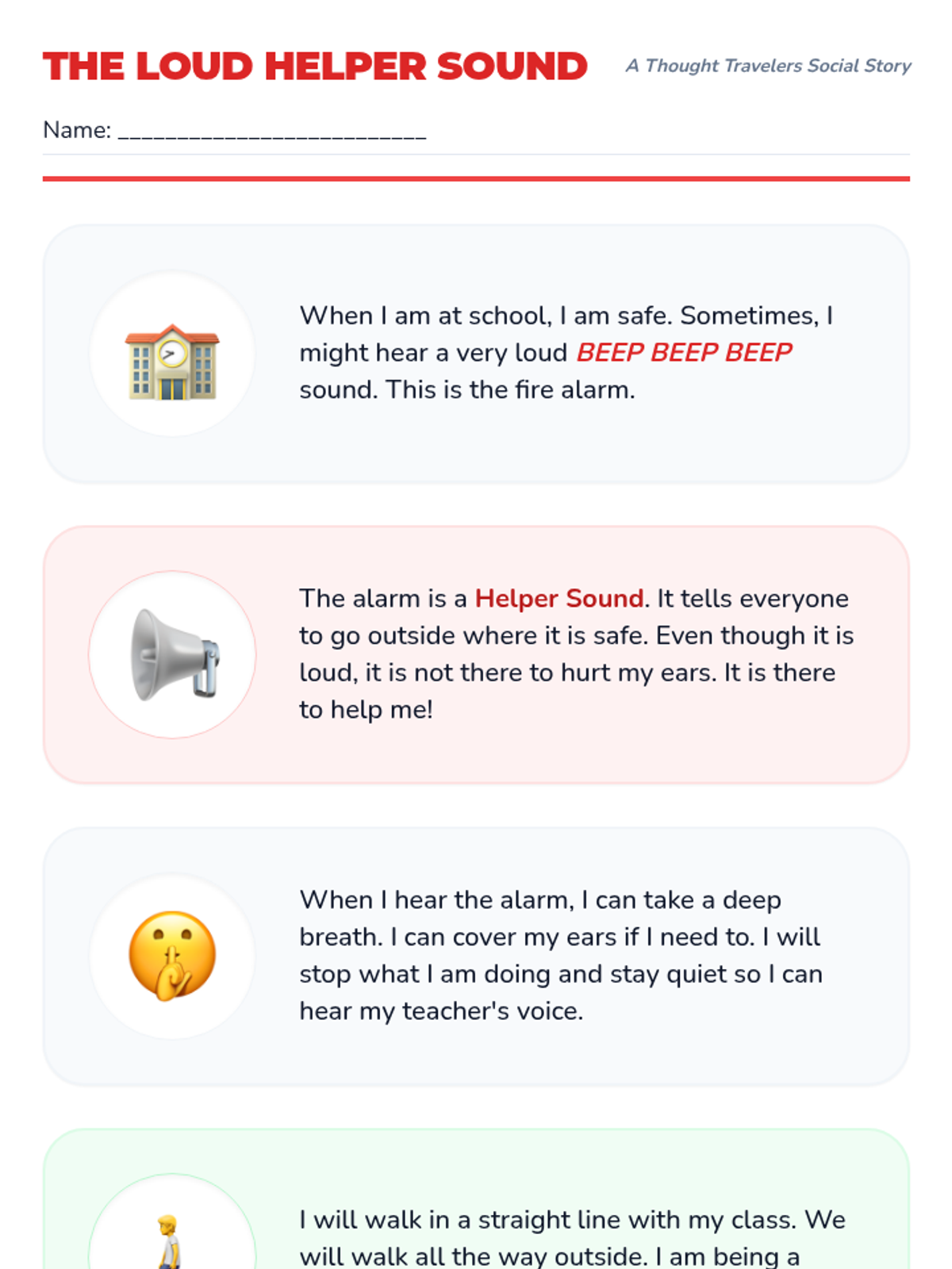 A social story with visual panels helping 1st graders understand fire drills and how to manage the loud noise of the alarm.