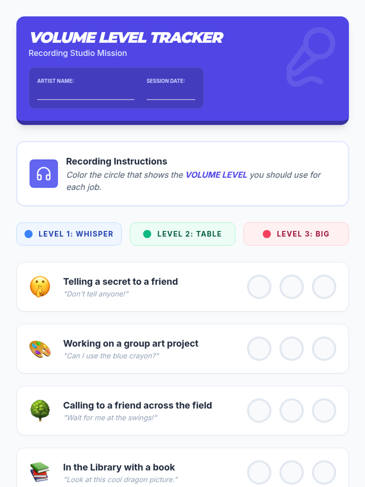 A 1st Grade worksheet where students identify the appropriate voice volume level for different scenarios using a tracking grid design. Supports self-monitoring skills.