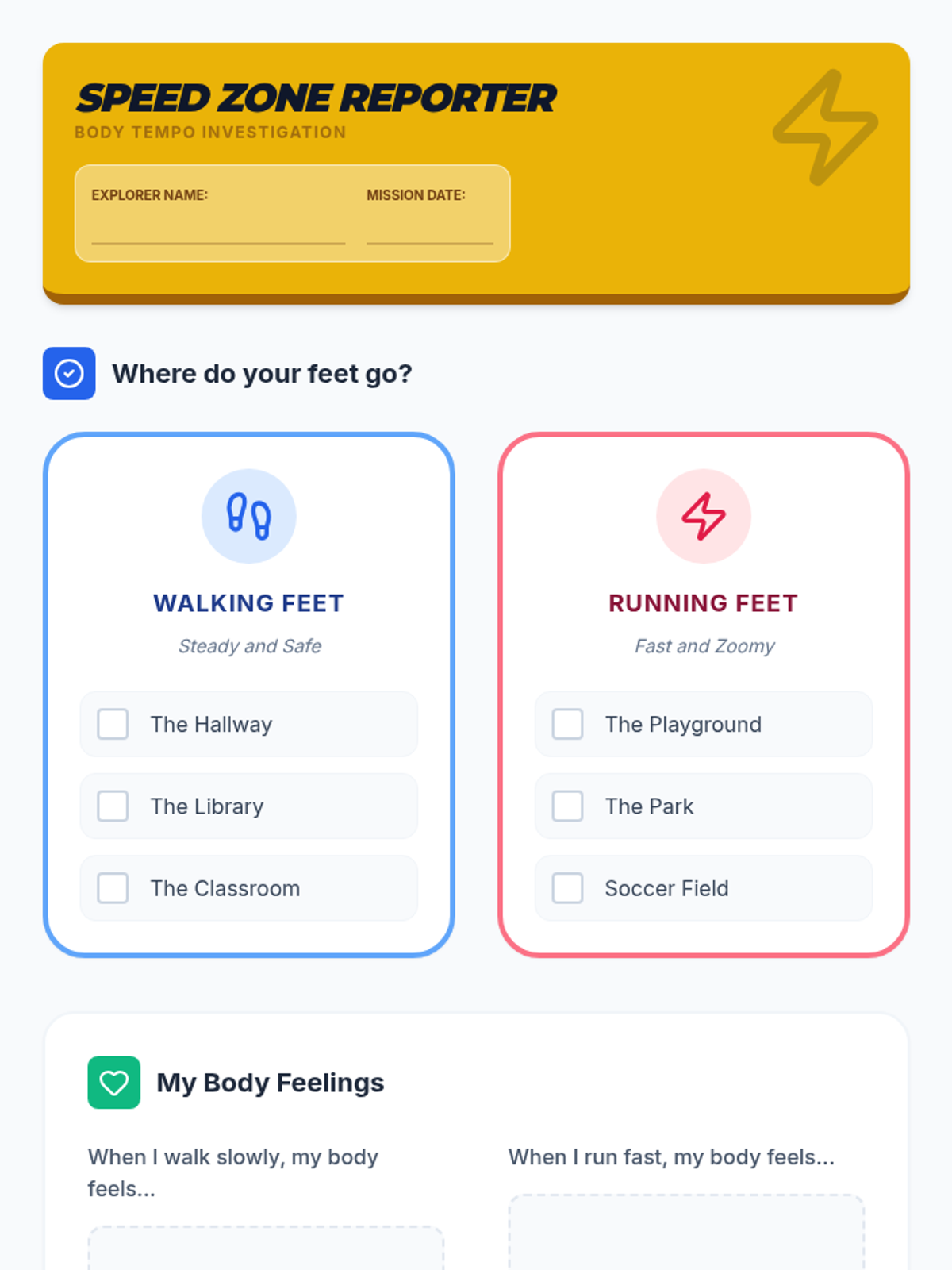 A 1st Grade worksheet where students identify appropriate locations for walking and running feet and reflect on their physical state at each speed.