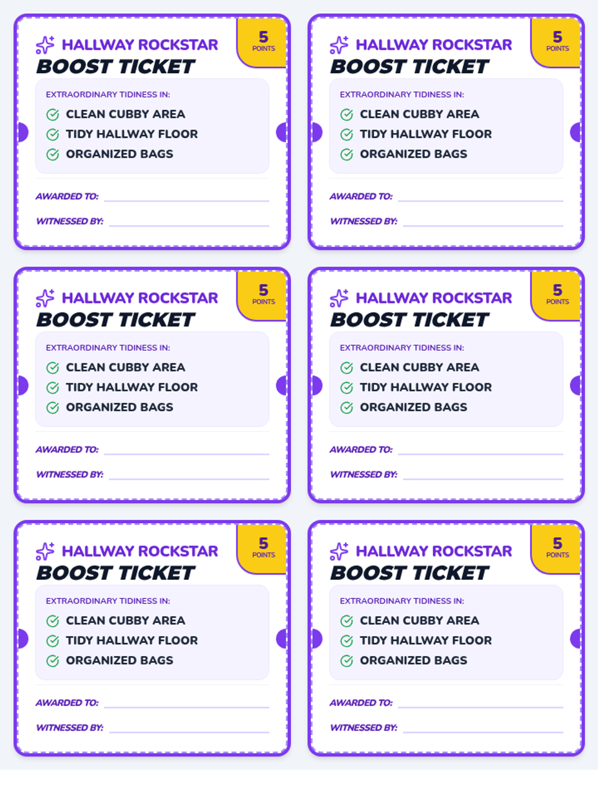 A printable sheet featuring six high-value "Cubby Hallway Boost" tickets worth five points each, intended for whole-class recognition of maintaining clean and organized common spaces.