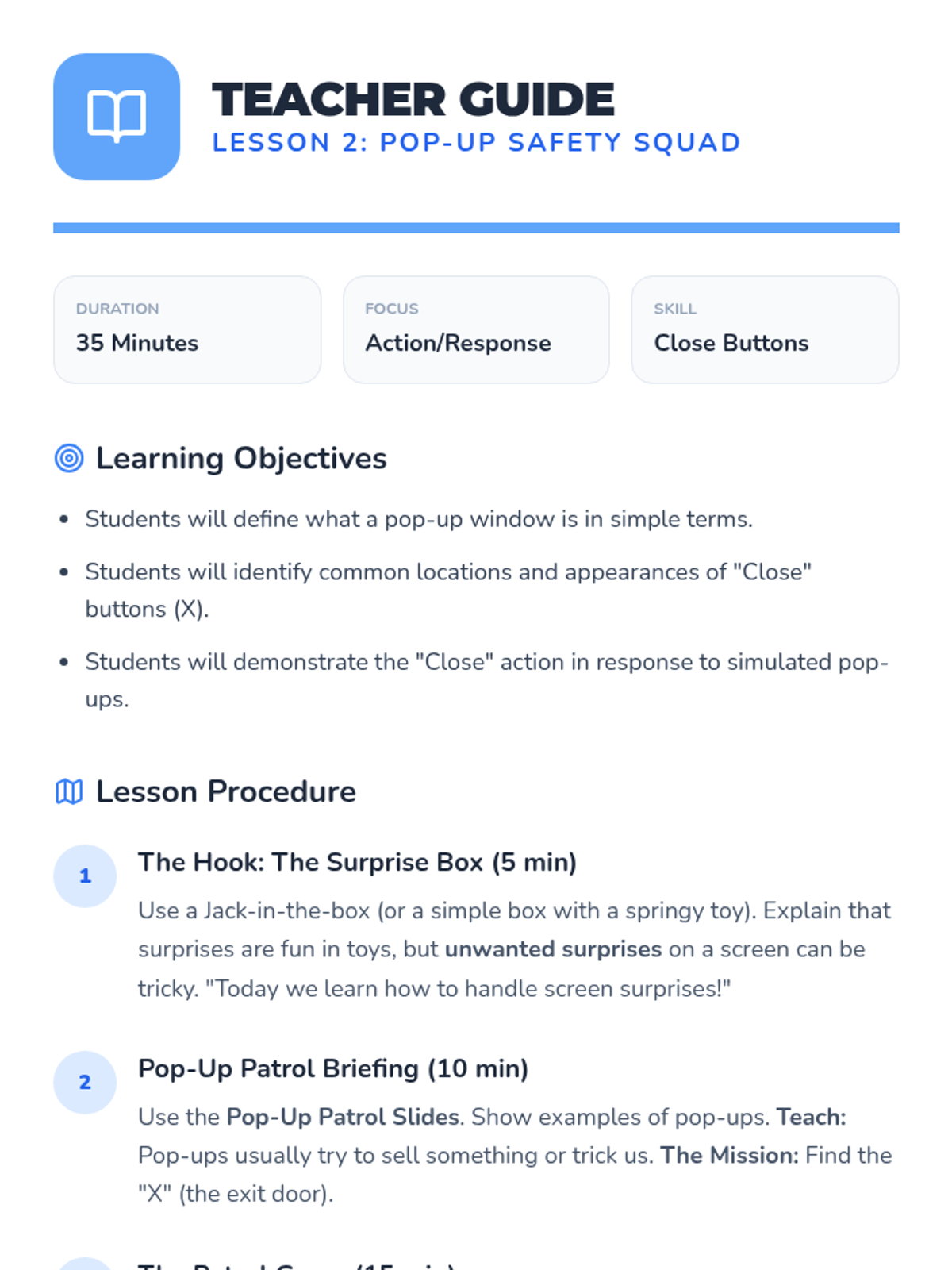 Teacher guide for Lesson 2, providing instructional steps for the "Pop-Up Patrol" game and teaching students how to handle unwanted windows.