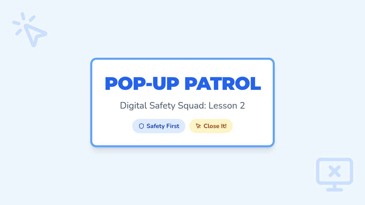 Slides for Lesson 2, focusing on identifying pop-ups and learning how to safely close them using the 'X' button.