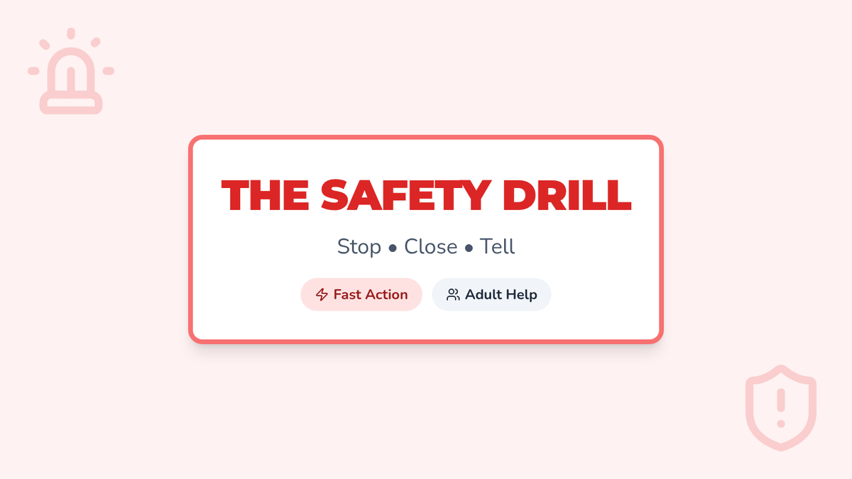 Slides for Lesson 3, introducing the 'Stop, Close, Tell' safety drill and explaining each step clearly for students.