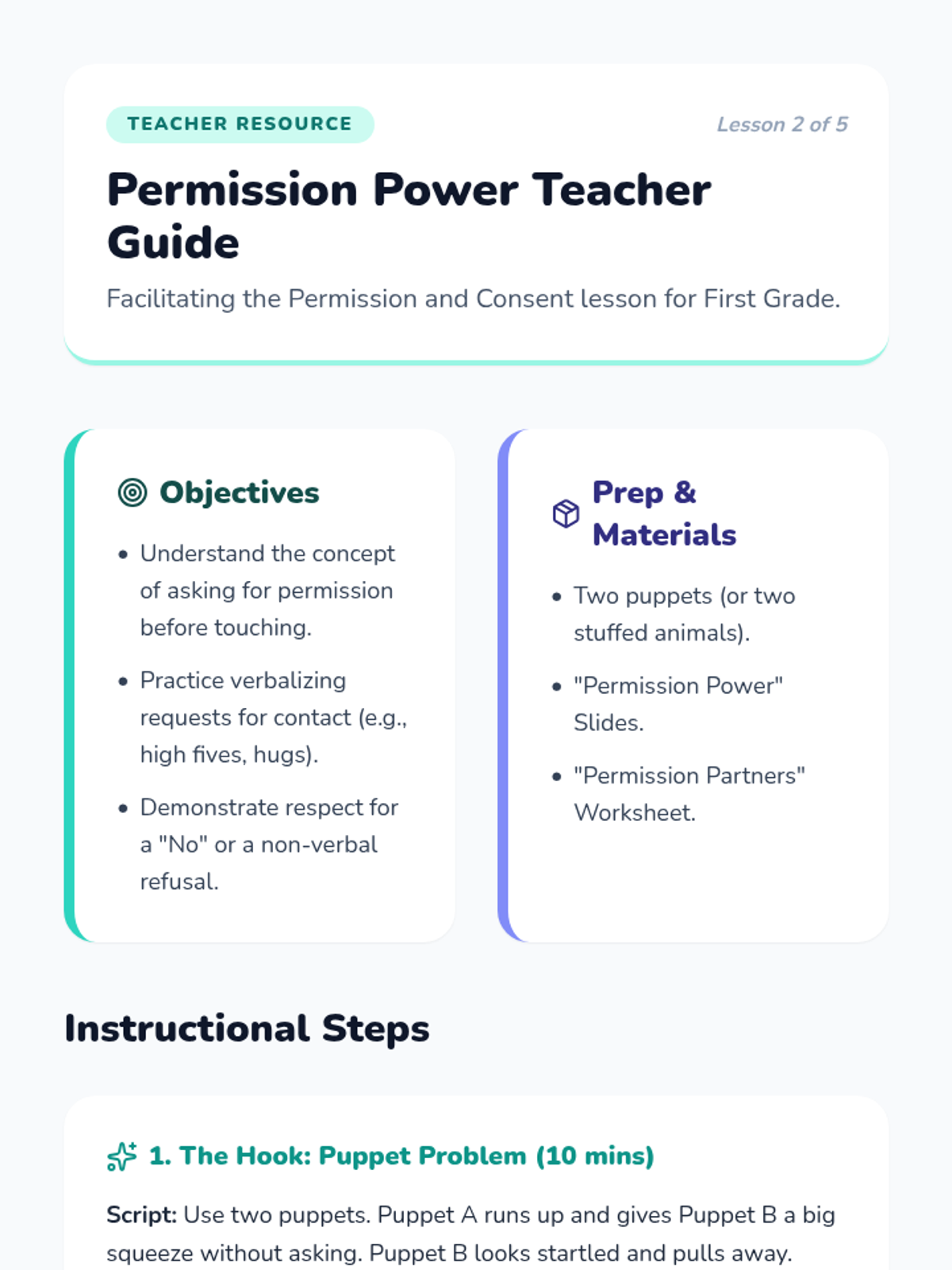 A teacher guide for the second lesson, providing instructions for the puppet show hook, "Ask, Wait, Respect" model, and role-play activities.