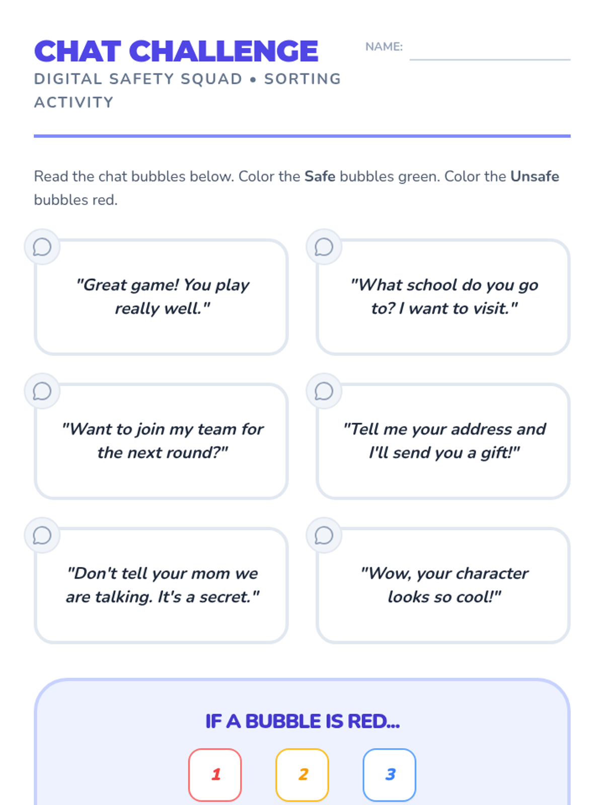 Student activity sheet for sorting safe and unsafe game chat messages, reinforcing the 'Stop, Close, Tell' response for red flag messages.
