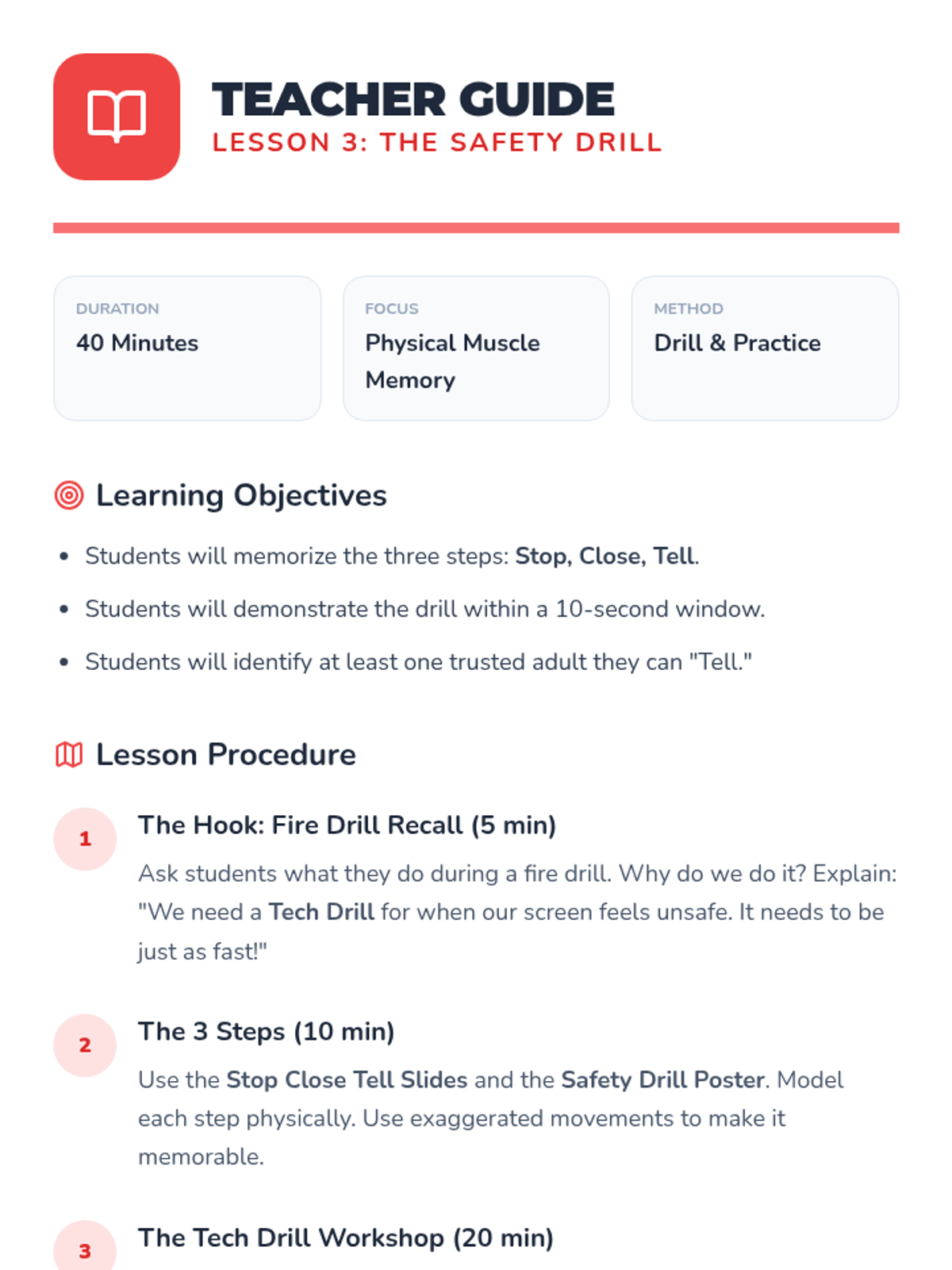 Teacher guide for Lesson 3, providing instructional steps for the 'Stop, Close, Tell' safety drill and tips for effective practice.