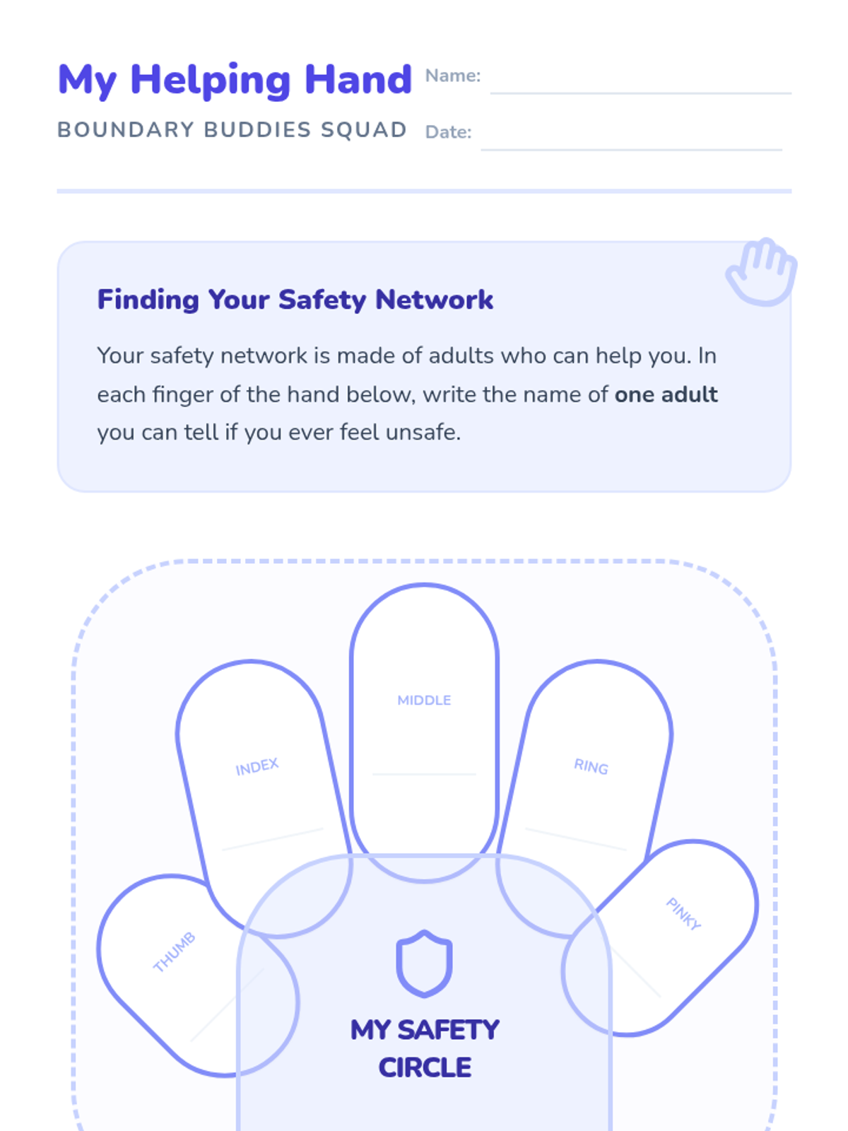 A project worksheet for first-grade students to identify five trusted adults in their safety network by writing their names in a "helping hand" diagram.