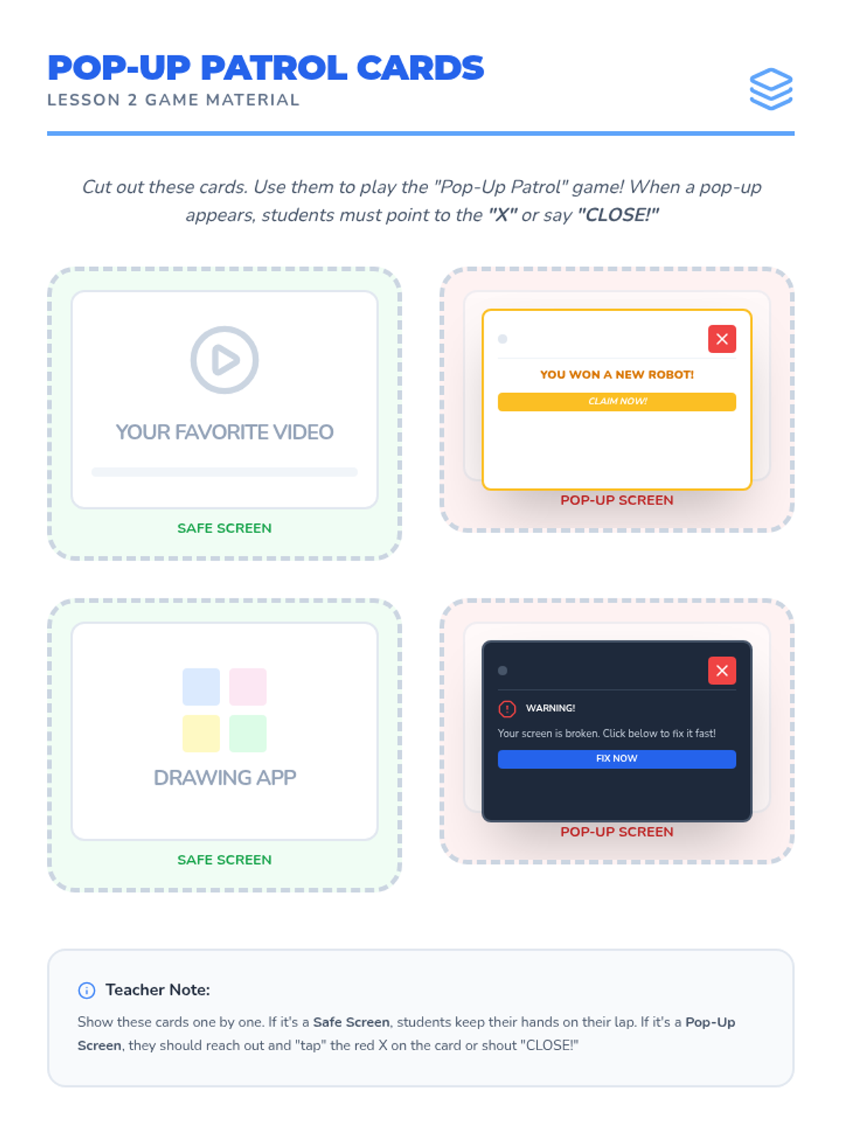 Game cards for Lesson 2 featuring safe screens and pop-up scenarios to help students practice identifying and closing unwanted windows.