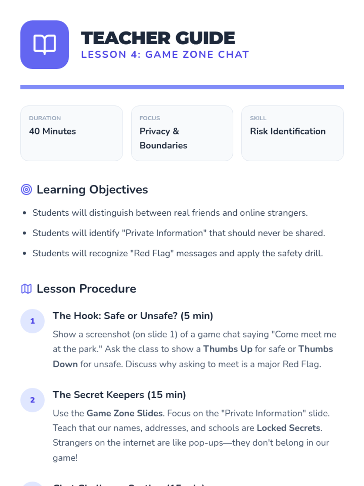 Teacher guide for Lesson 4, providing instructional steps for the "Game Zone" discussion and chat sorting activity.