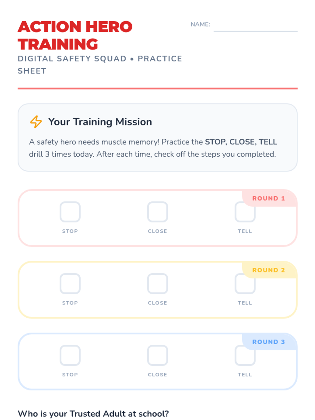 Student practice sheet for the 'Stop, Close, Tell' drill, featuring check-boxes for each round of practice and a section to identify a trusted adult.