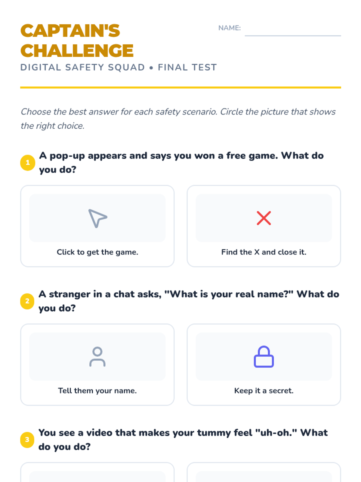 A visual final assessment for students to demonstrate their understanding of digital safety scenarios and correct responses.