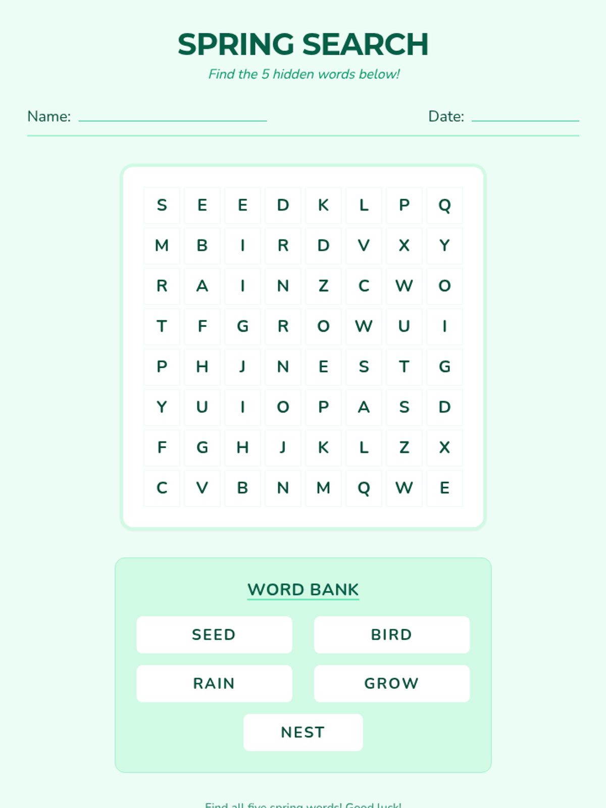 A compact spring-themed word search for students, featuring five easy words (SEED, BIRD, RAIN, GROW, NEST) in an 8x8 grid. Optimized for printing on a single page.
