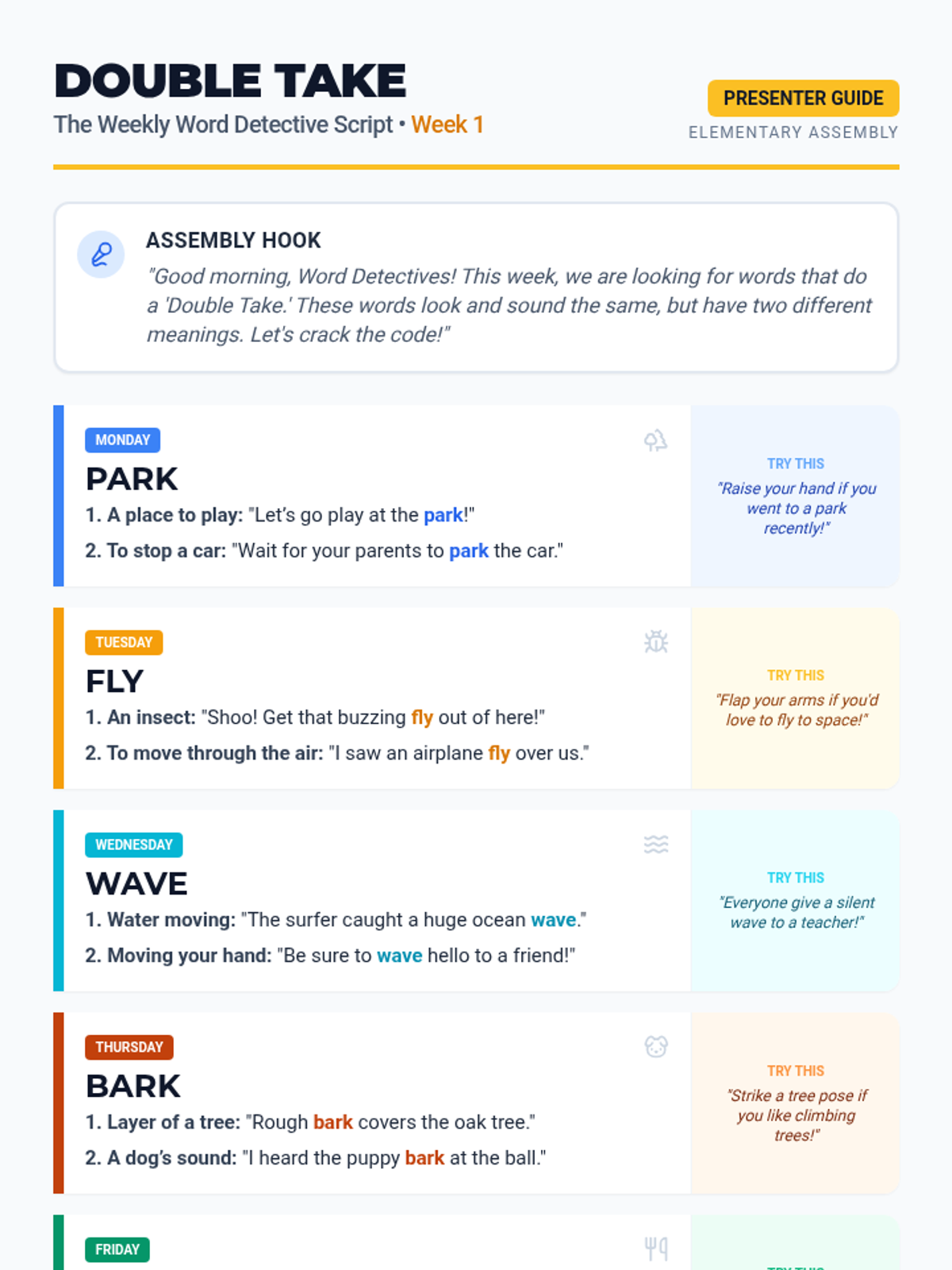 An expanded two-week presenter guide for morning assemblies, providing ten multiple-meaning words (homonyms) with definitions, sentence examples, and interactive student prompts.
