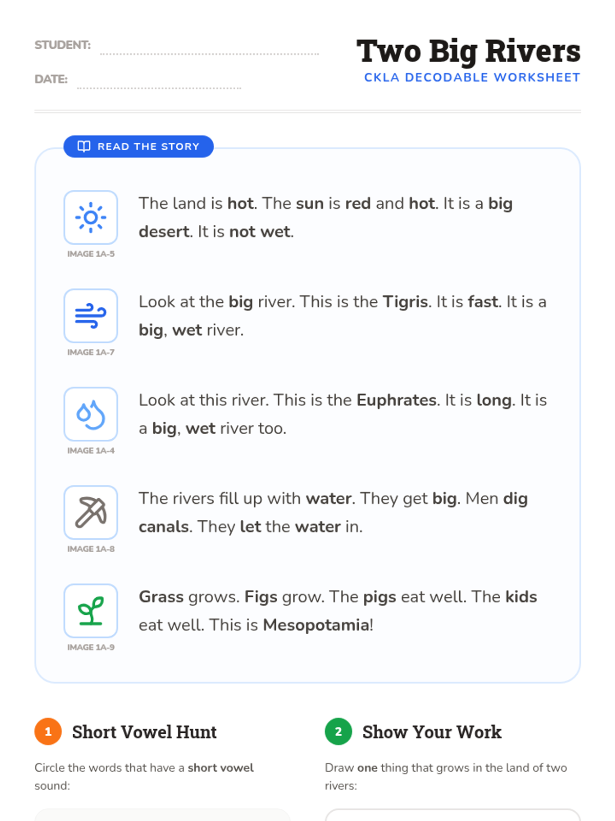 A decodable reading worksheet for first-grade students, focusing on short vowels and CVC words to explain the importance of the Tigris and Euphrates rivers. Includes a reading passage with CKLA image references, a word hunt activity, and a drawing space for student reflection.