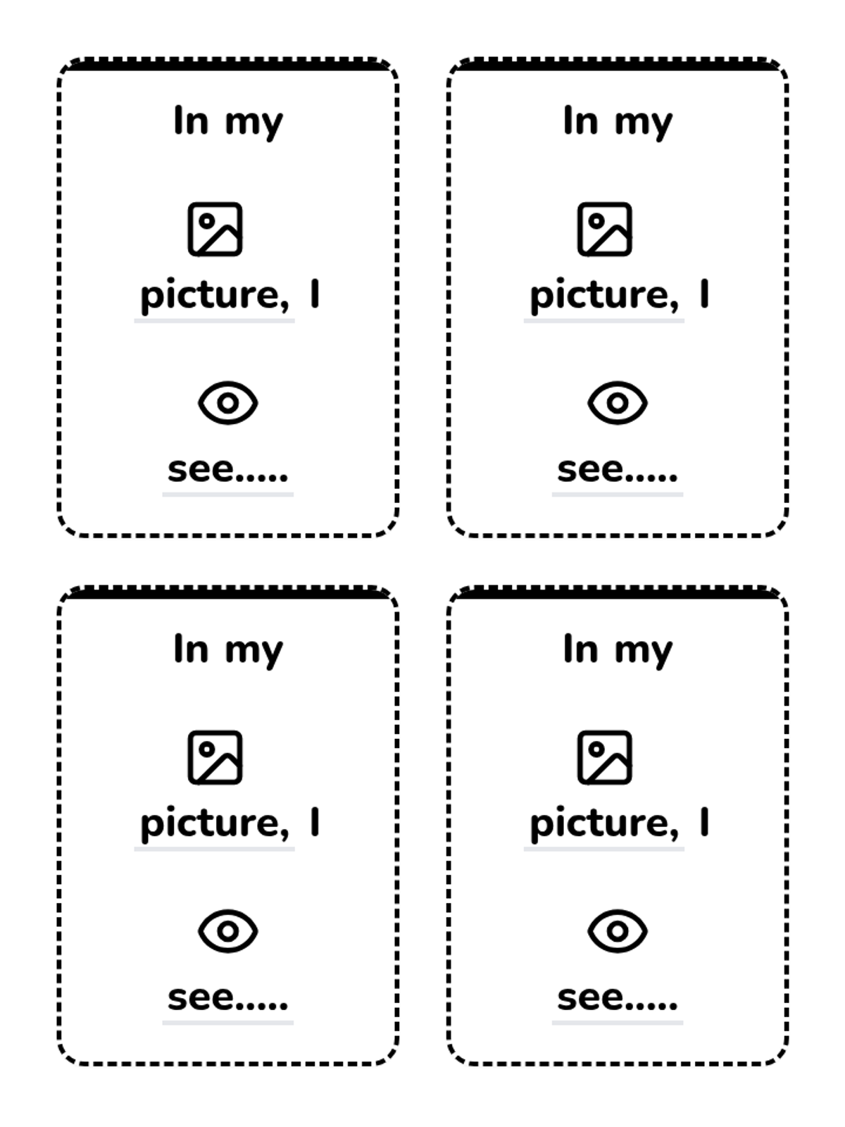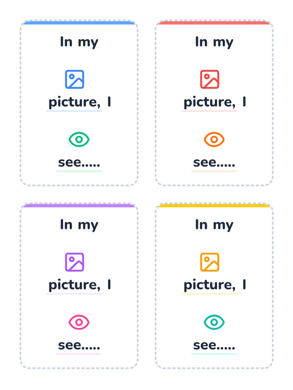 A set of 4 printable prompt cards for kindergarteners with the sentence frame 'In my picture, I see.....' featuring helpful icons above key words to support emerging readers. Each card has a unique color accent and a dashed border for easy cutting.