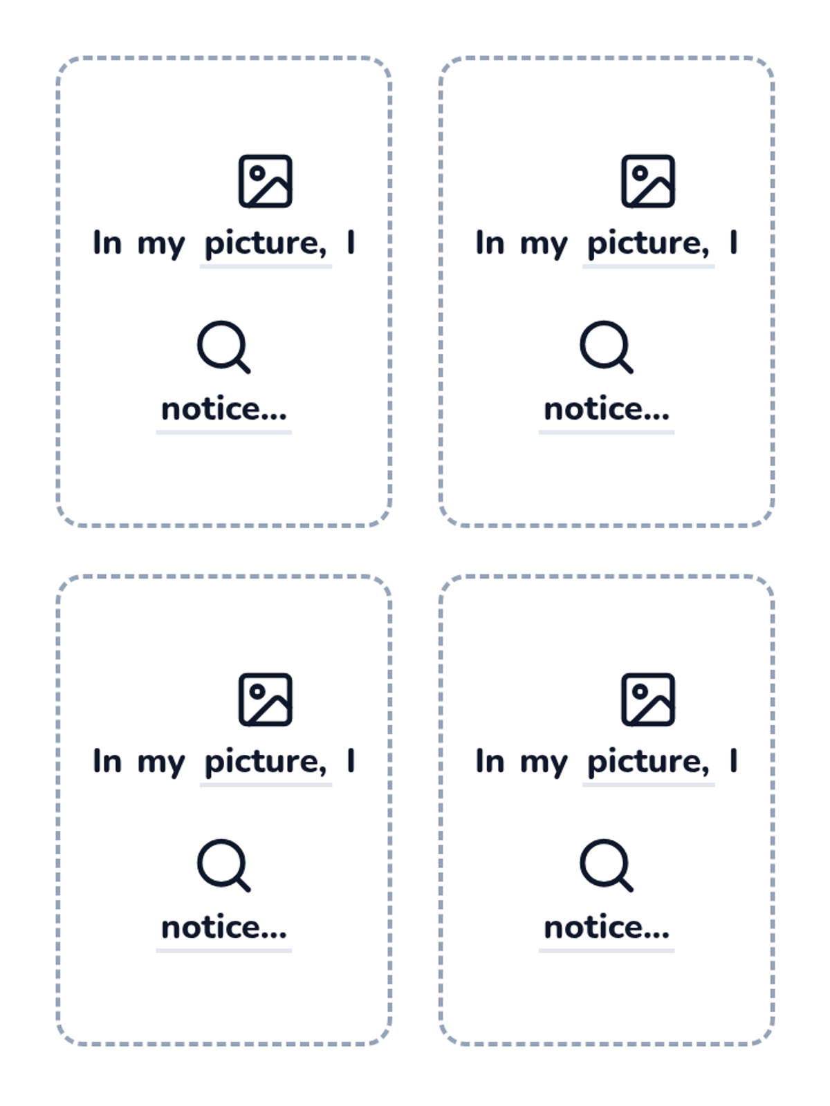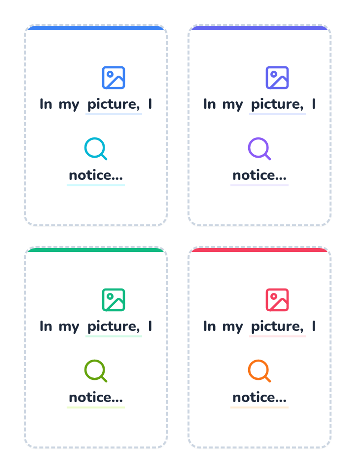 A set of 4 printable prompt cards for kindergarteners with the sentence frame 'In my picture, I notice...' featuring helpful icons above key words to support emerging readers. Each card has a unique color accent and a dashed border for easy cutting.