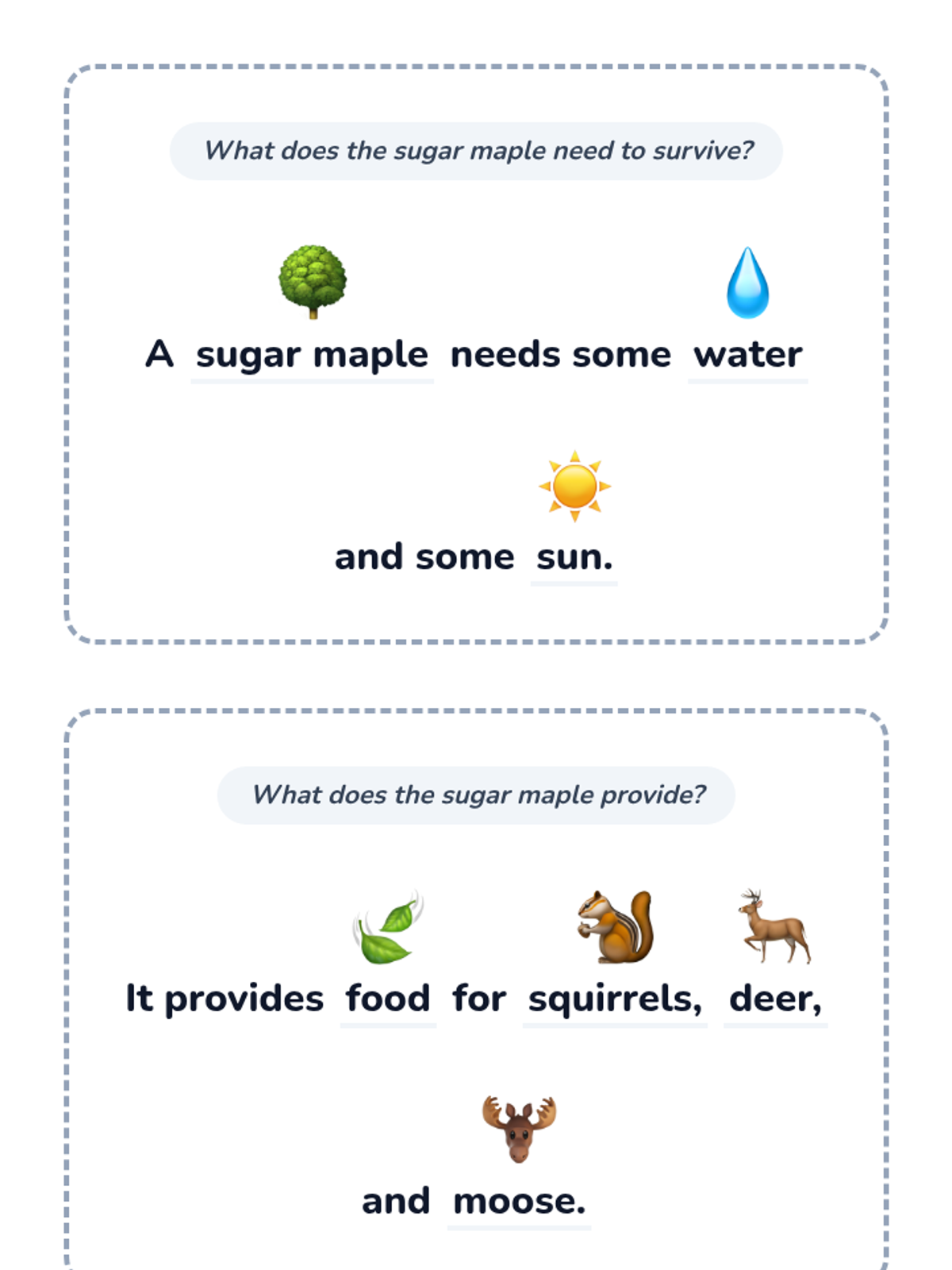 A set of 2 black and white printable prompt cards for kindergarteners about sugar maples. Features sentence frames for 'What does the sugar maple need to survive?' and 'What does the sugar maple provide?' with helpful icons above key words to support emerging readers.