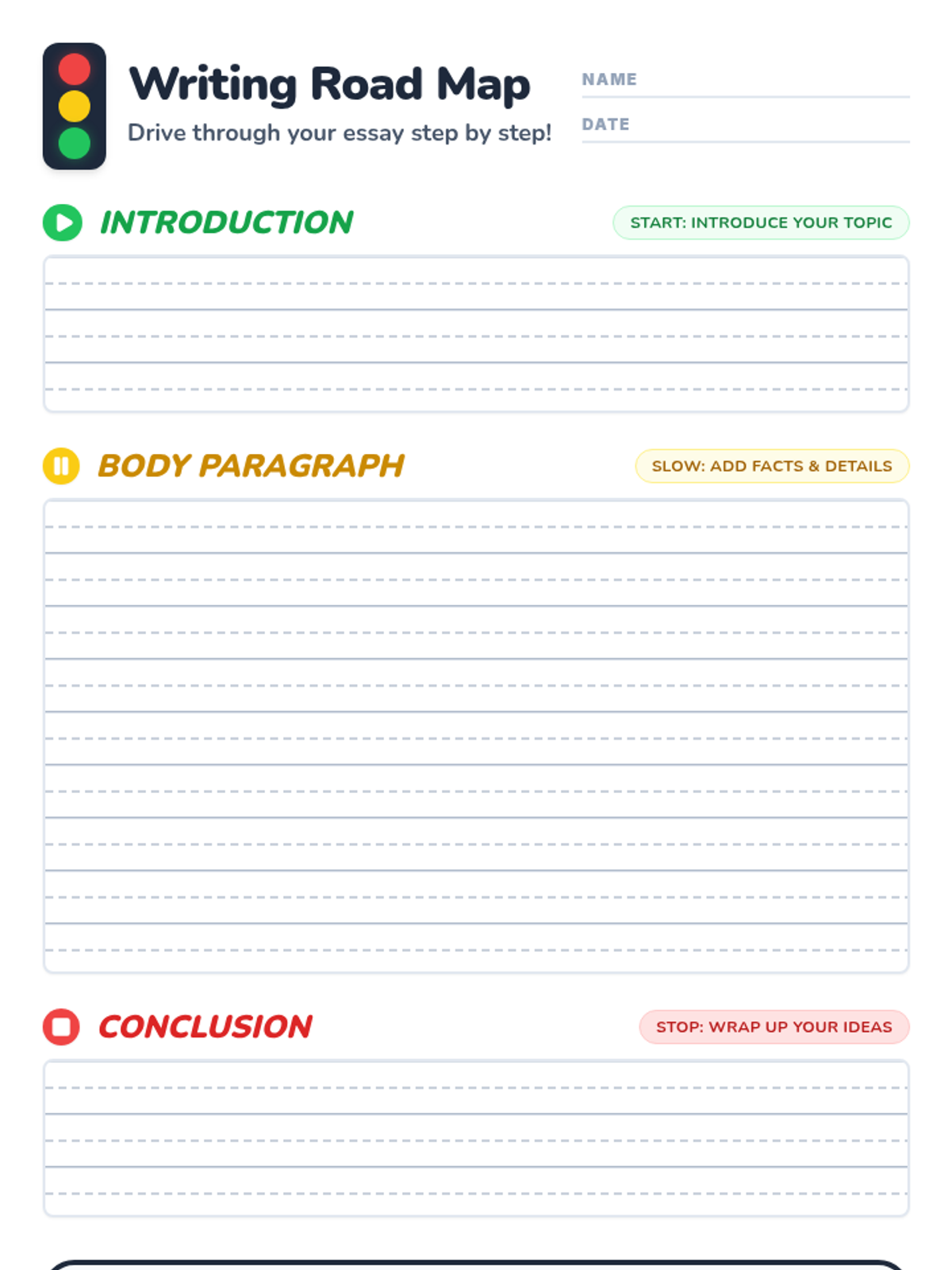 A writing graphic organizer for primary students featuring a traffic light theme. It includes separate sections for introduction, a large body area, and conclusion with tri-line writing guides and editing checklists.