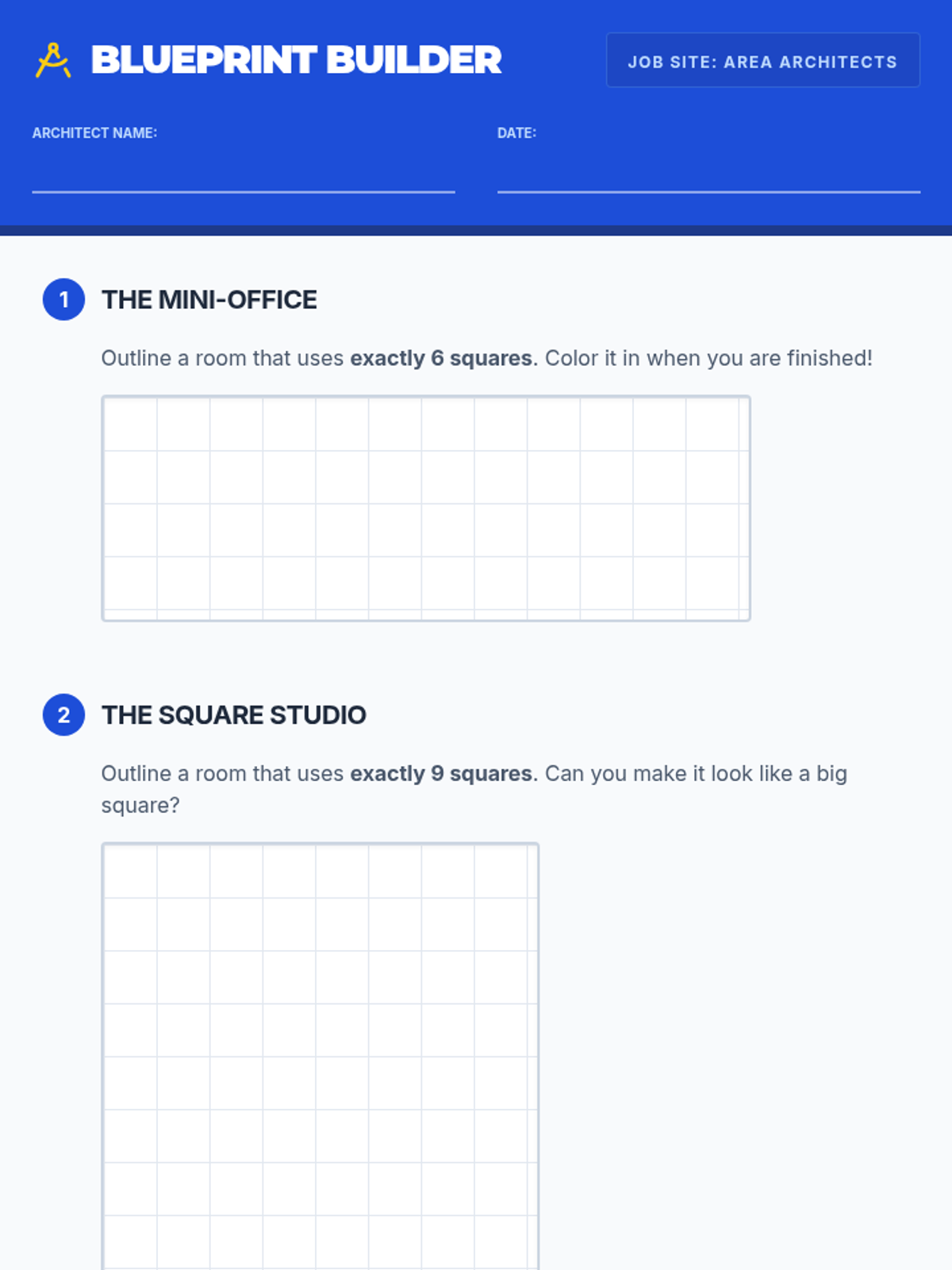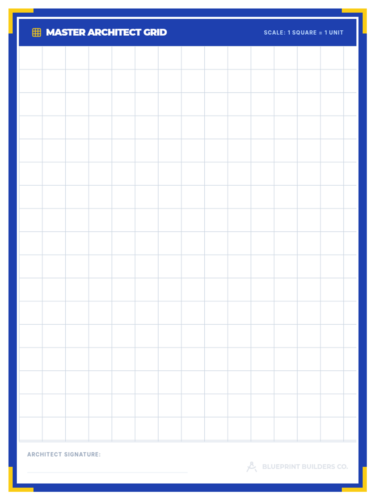 A full-page, themed graph paper with 1st-grade-appropriate square sizing for architectural area design and array practice.