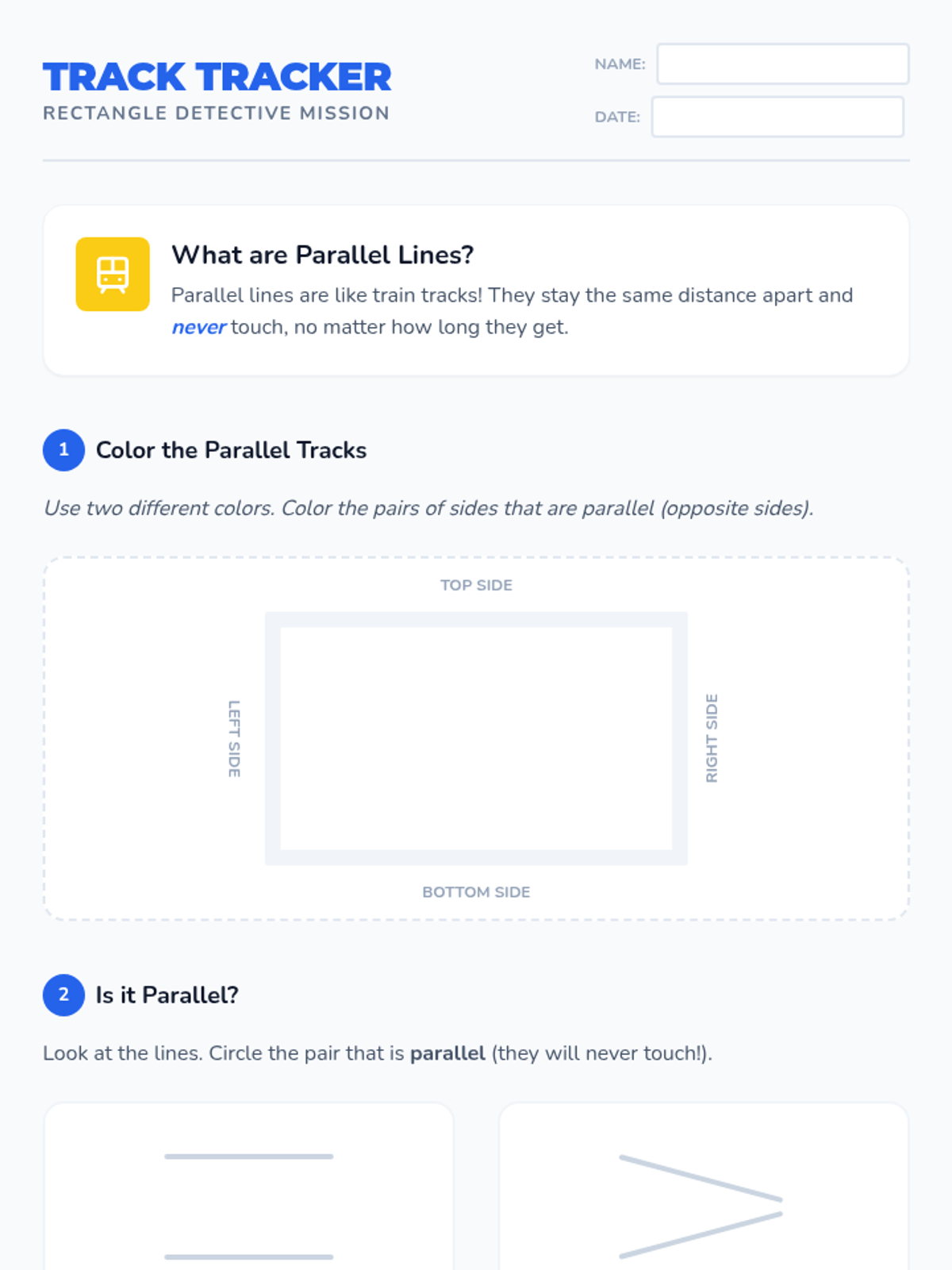A 1st-grade worksheet focused on identifying and coloring parallel sides on a rectangle, featuring a 'train track' theme to match the lesson's warm-up.