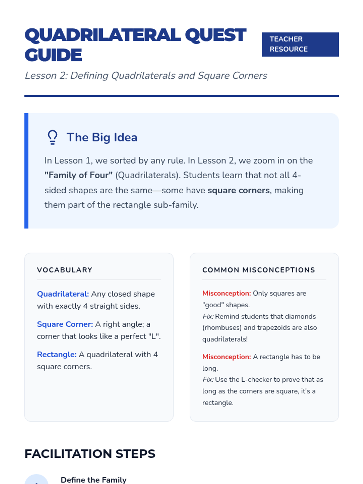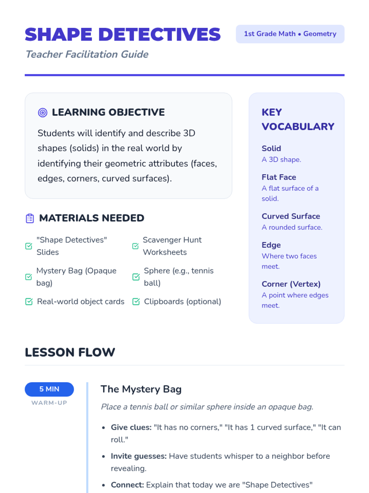A comprehensive teacher guide for the Shape Detectives lesson, including learning objectives, materials, vocabulary, and a step-by-step facilitation guide with video pause points.