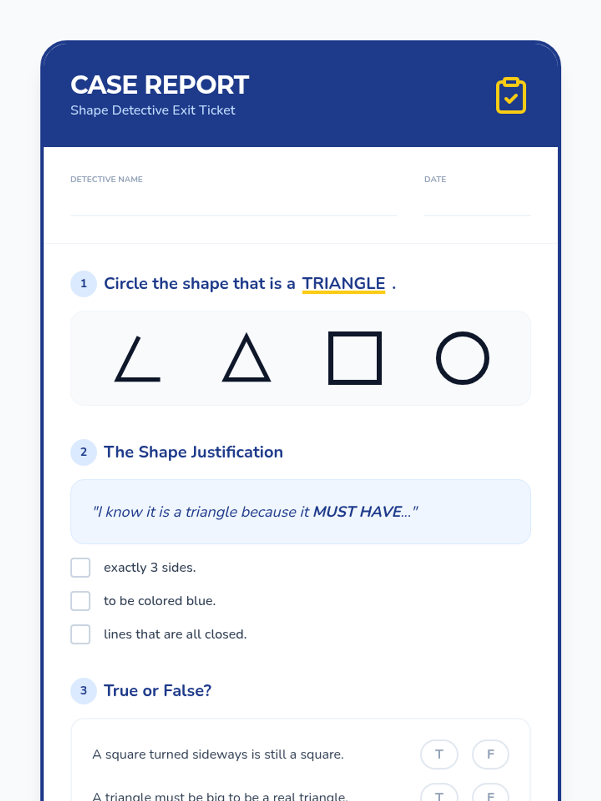 A comprehensive instructional guide for teachers to lead the Shape Detectives lesson, including warm-up prompts, video timestamps, activity instructions, and key debriefing questions.