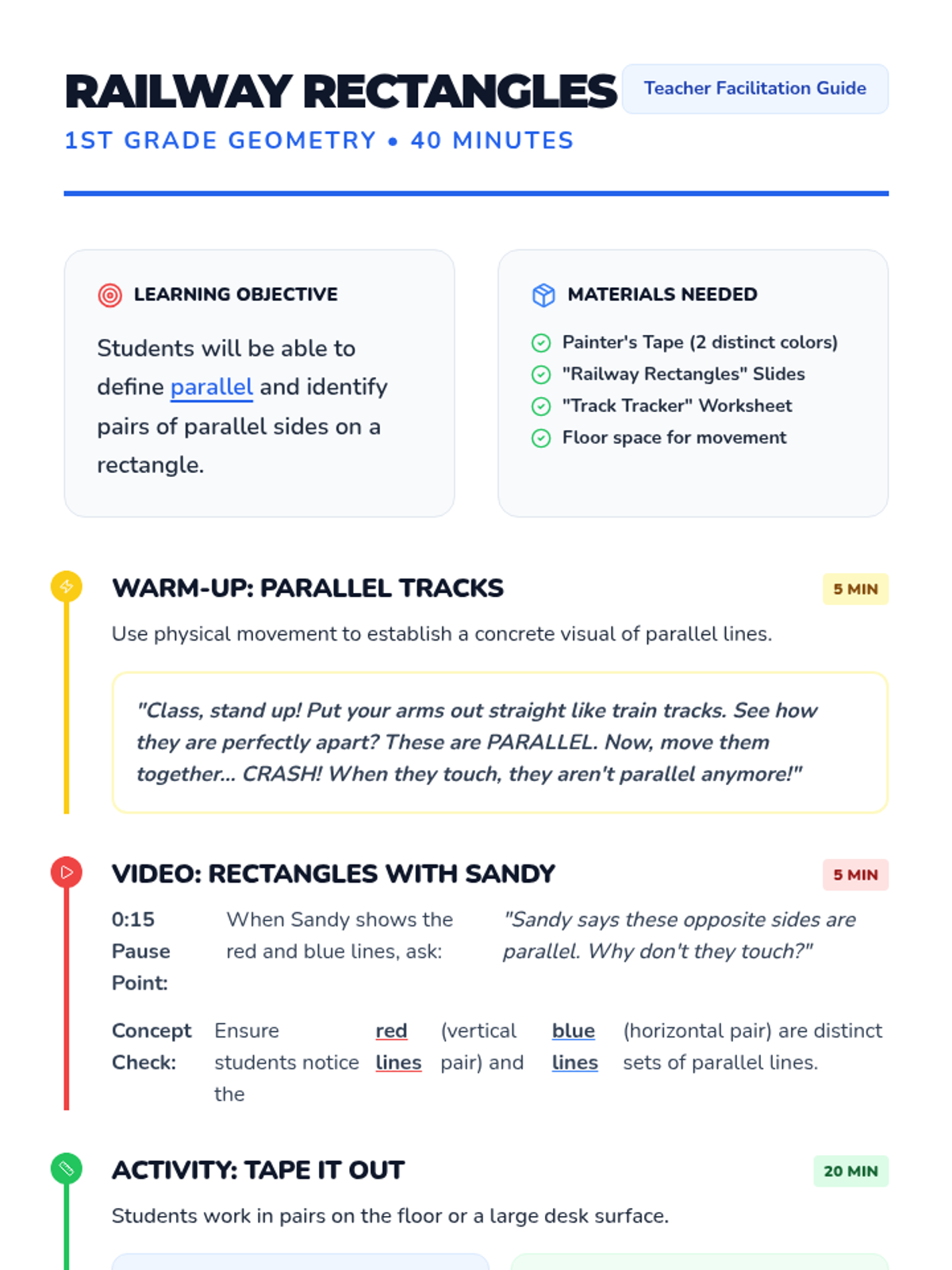 A comprehensive teacher guide for the 'Railway Rectangles' lesson, featuring step-by-step facilitation instructions, discussion prompts, and differentiation strategies.