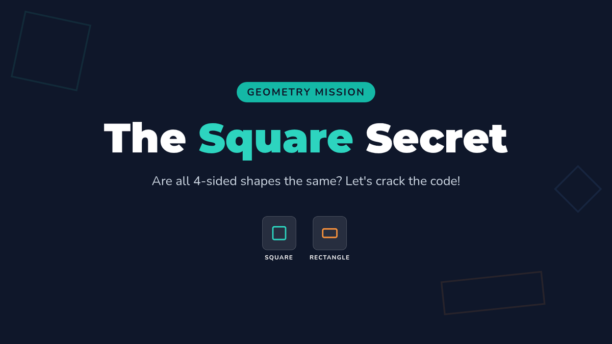 A vibrant 16:9 presentation for the 'Square Secret' lesson, including warm-up prompts, the embedded 'Describing and Naming Shapes' video, clear definitions with visual aids, and step-by-step activity instructions.