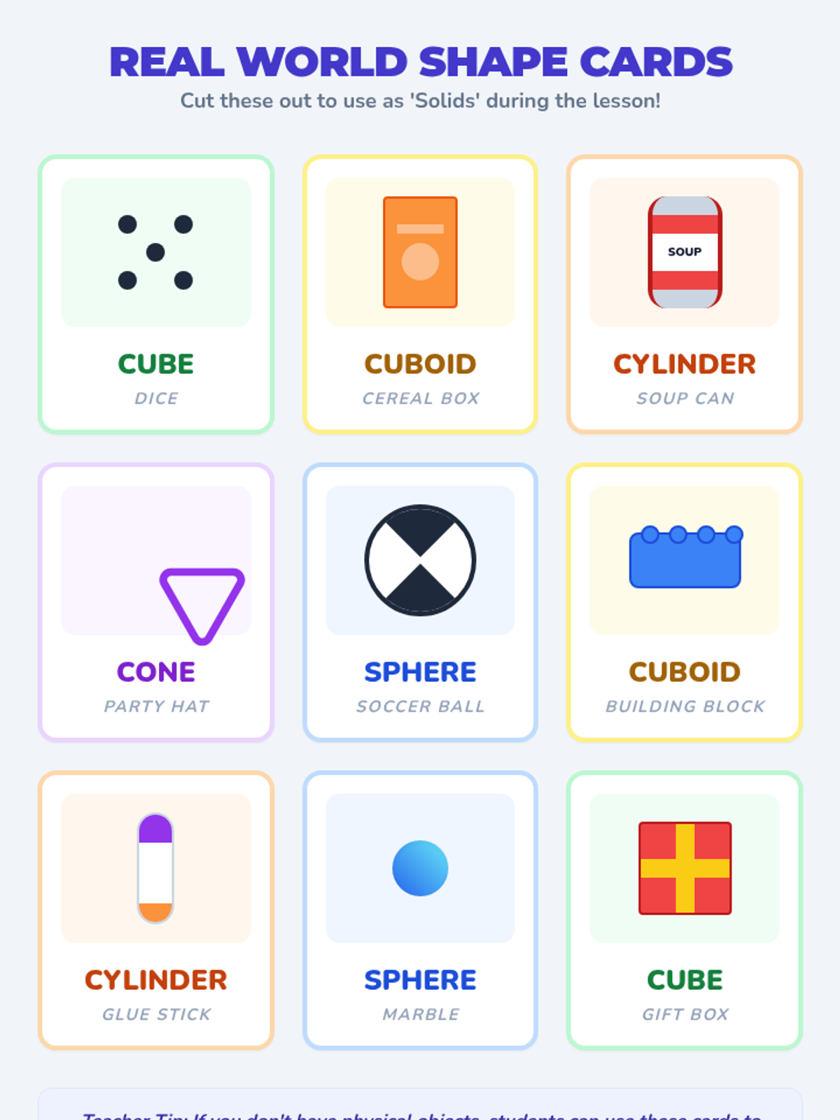 A set of printable flashcards featuring common real-world objects that correspond to 3D shapes (Cube, Cuboid, Cylinder, Cone, Sphere), providing visual examples for classroom use.
