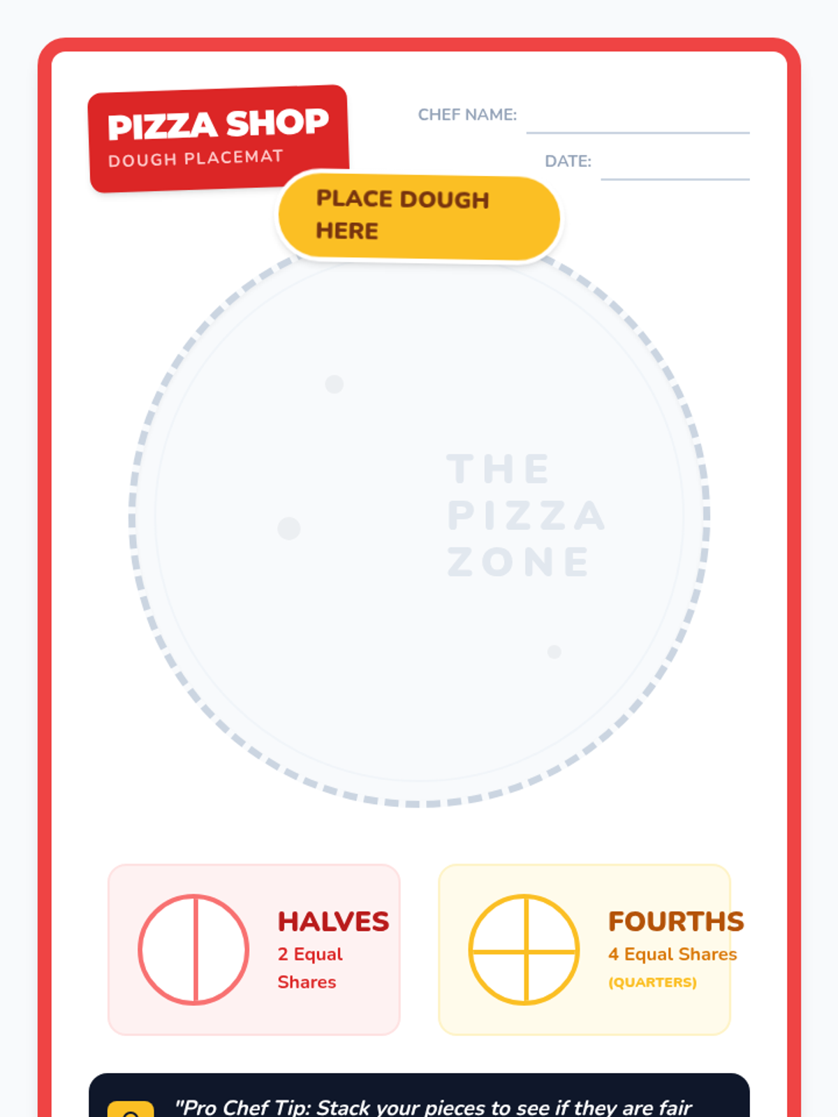 A fun, pizza-themed laminated placemat for students to use as a workspace for Play-Doh fraction partitioning activities.