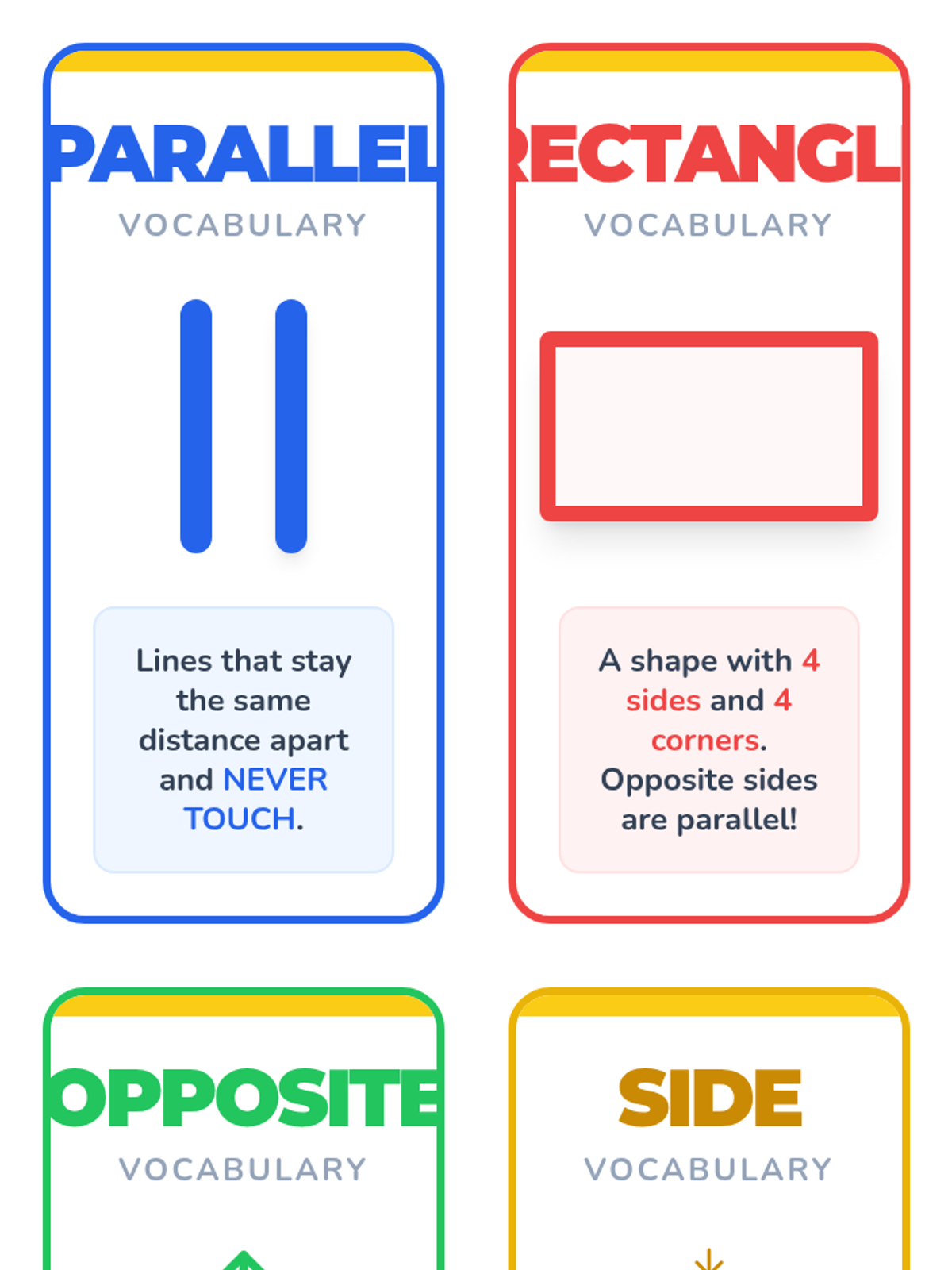Large-format vocabulary cards for 'Parallel', 'Rectangle', 'Opposite', and 'Side' with clear visual definitions for 1st-grade learners.