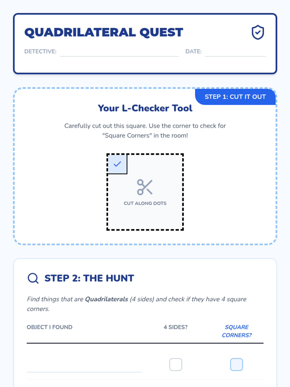 A student activity sheet including a cut-out 'L-checker' tool and a recording table for a classroom scavenger hunt to find objects with square corners.