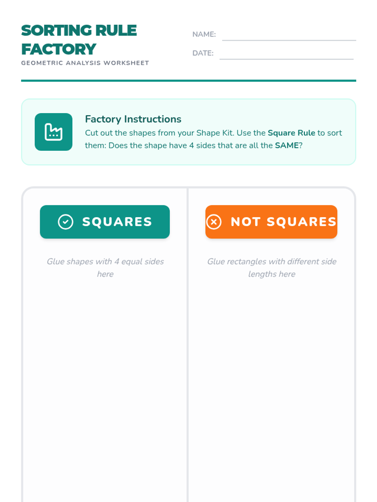 A specialized sorting mat for students to categorize paper shapes into 'Squares' or 'Rectangles' based on their investigated side lengths.