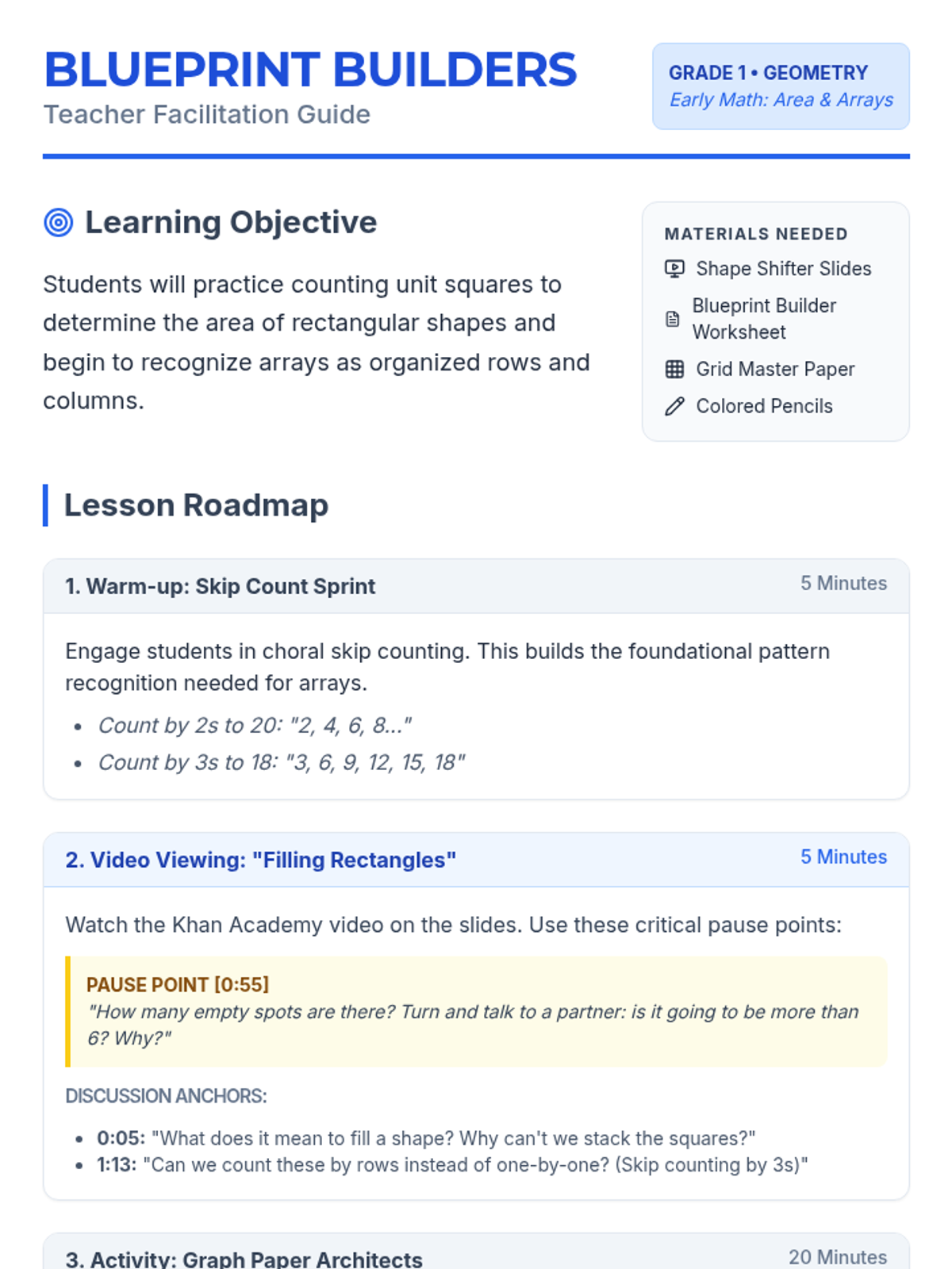 A comprehensive teacher facilitation guide for the Blueprint Builders lesson, including pacing, skip counting prompts, and specific video pause points.