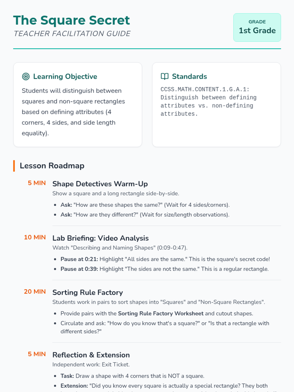 A comprehensive teacher facilitation guide for 'The Square Secret' lesson, including learning objectives, a detailed 40-minute timeline with video pause points, and a materials checklist.