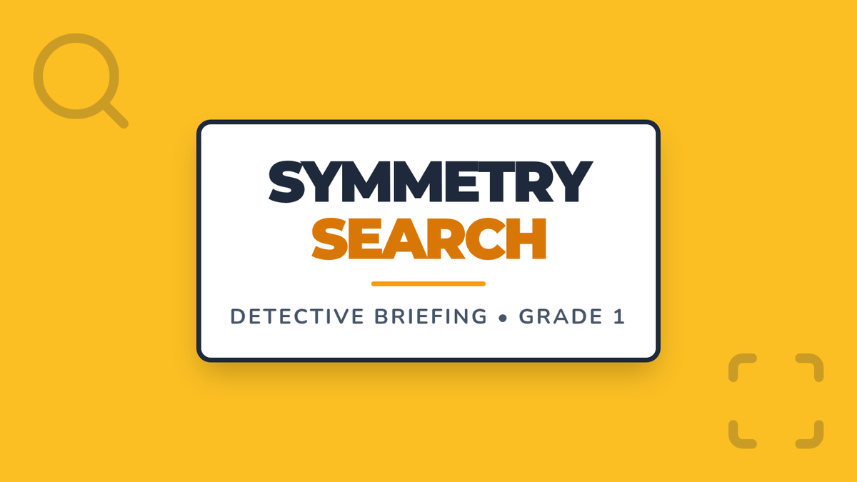 A visual presentation for the Symmetry Detectives lesson, featuring a triangle warm-up, an embedded summary video recap, mission instructions for the classroom search, and a 'Clock Mystery' discussion slide.