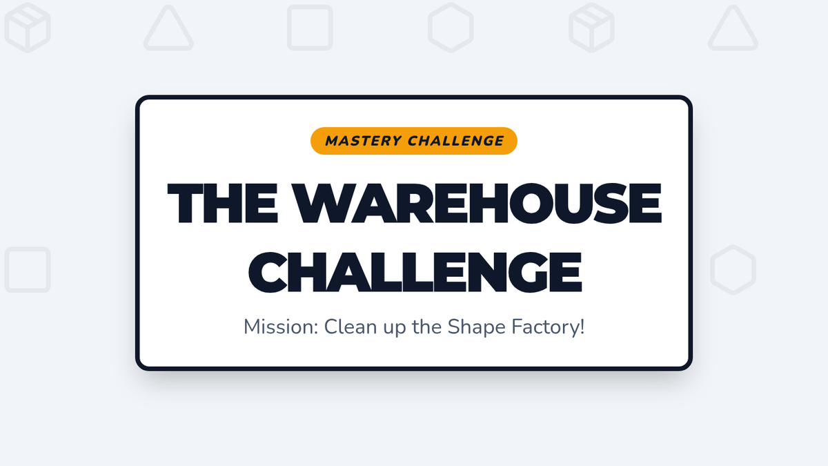 Introductory slides for the final mastery challenge, setting up the 'Shape Warehouse' scenario and review of classification rules.