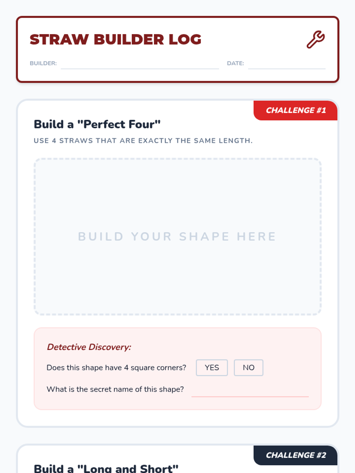 A student building mat for creating squares and rectangles with straws. Includes discovery prompts about side lengths and corner types.