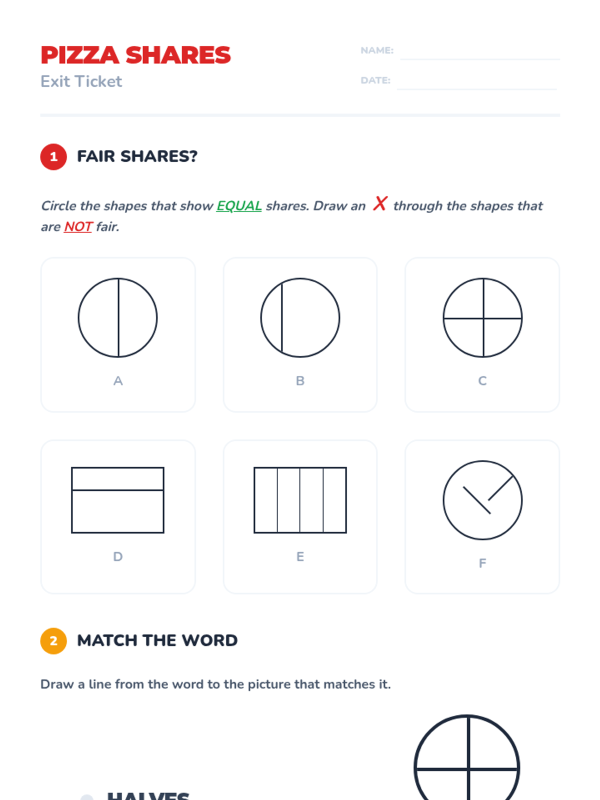 A formative assessment for 1st-grade students to identify equal shares (halves and fourths) and match them to the correct terminology.