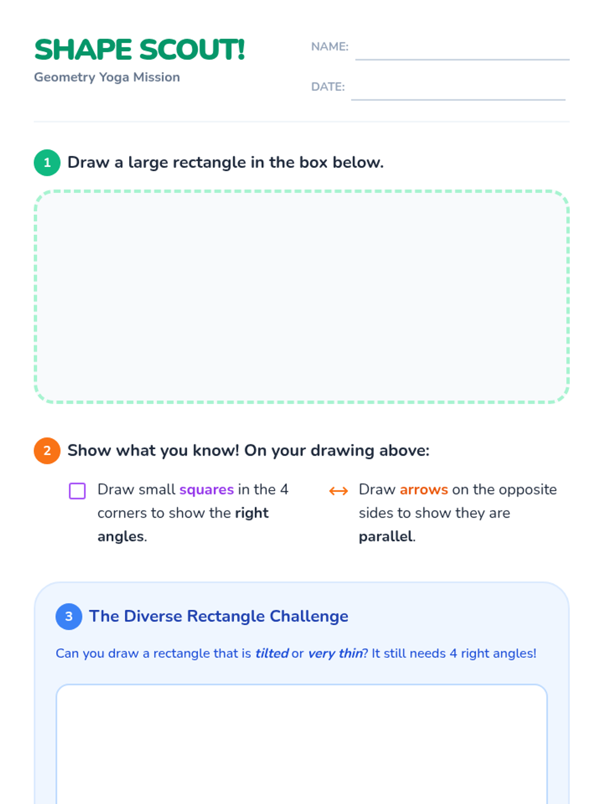A student worksheet for the Shape Shifters Yoga lesson where students draw a rectangle and label its key geometric features (right angles and parallel lines).