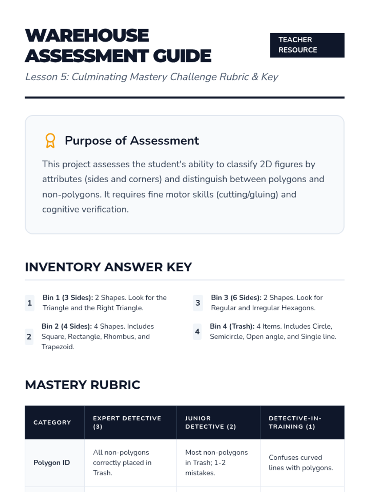 A student sorting project where they cut out various shapes and glue them into categories (3-sided, 4-sided, 6-sided, and non-polygons). Includes the sorting bins and the inventory sheet.